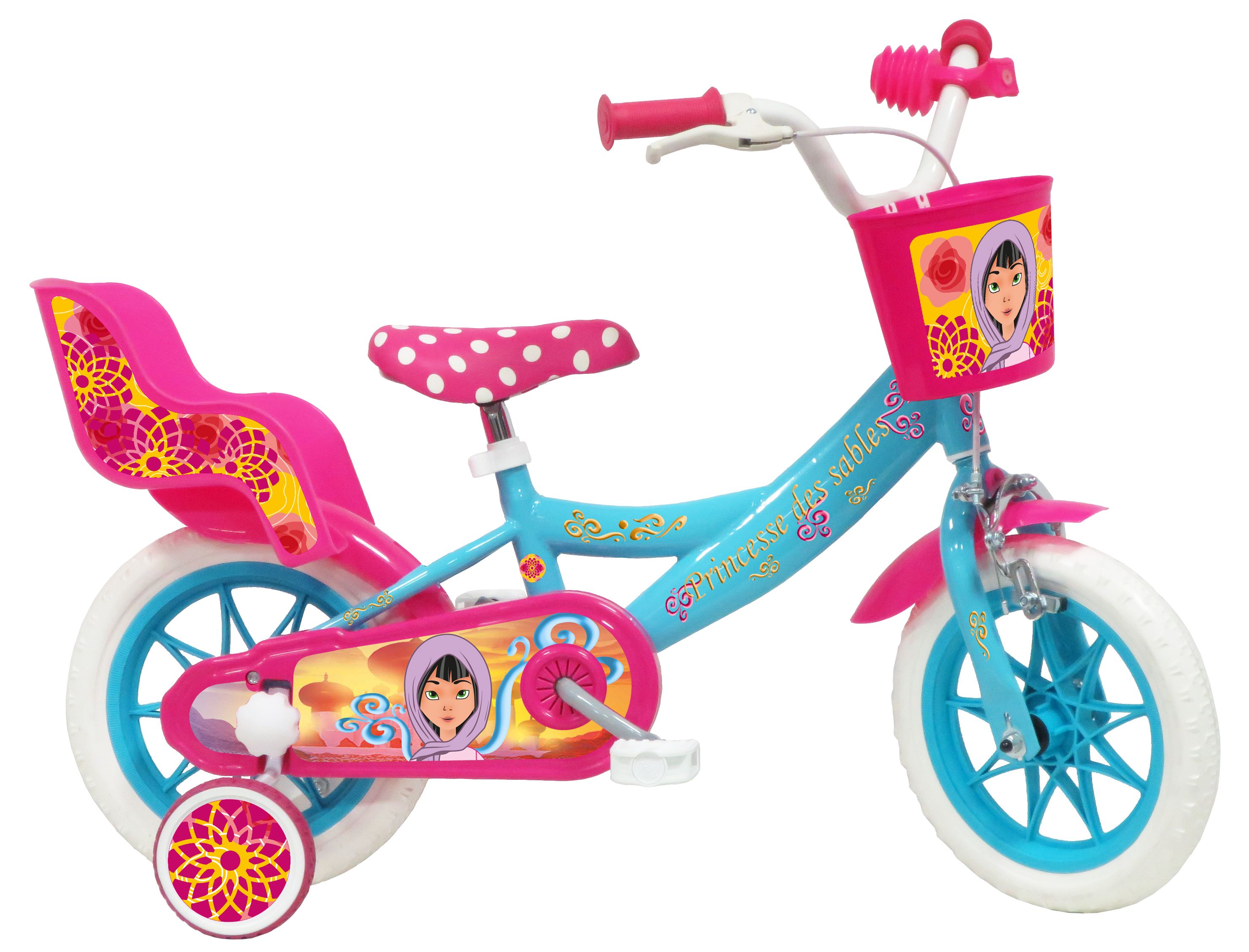 | Libellé | Vélo enfnant - Modèle 12" Fille Princesse des sables pour enfant de 3 à 5 ans avec stabilisateurs - Porte poupée - Panier avant - 1 frein |