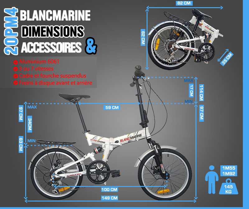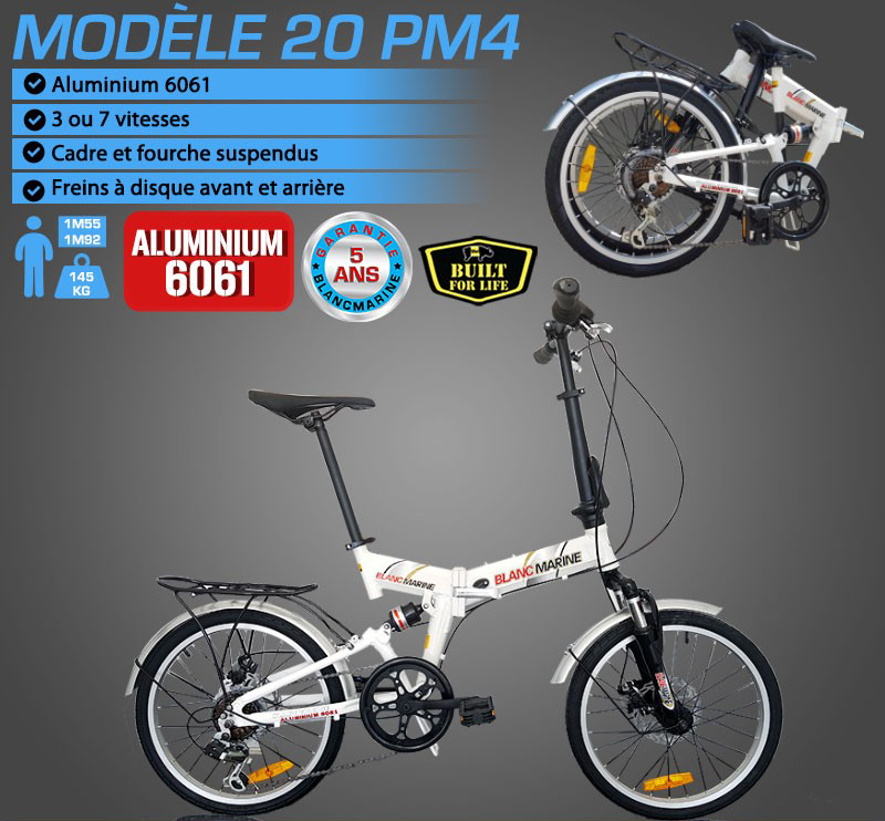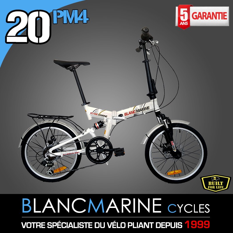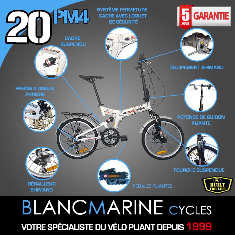 Compromis idéal entre encombrement et rendement, le vélo pliant pliant 20PM4, best seller de la gamme Blanc Marine, a été développé pour permettre de faire un grand nombre de kilomètres chaque jour et affronter tout types de terrains, de la ville aux sentiers forestiers accidentés. Robuste, agile et léger, le vélo pliant 20 PM4 est simple d'utilisation et demande peu d'entretien contrairement à beaucoup de ses concurrents. Avec une dimension de 82 cm de long, 62 cm de haut et 35 cm de large une fois plié, vous apprécierez la simplicité de son système de pliage ! Prêt à rouler en 15 secondes, parcourir des kilomètres sur ce vélo pliant devient un vrai plaisir grâce à son cadre suspendu en aluminium 6061 offrant un grand rendement et un maximum de confort. Avec une garantie de 5 ans pièces et main d'oeuvre, choisir un vélo pliant Blanc Marine c'est choisir la tranquillité et un SAV réactif et proche de ses clients.