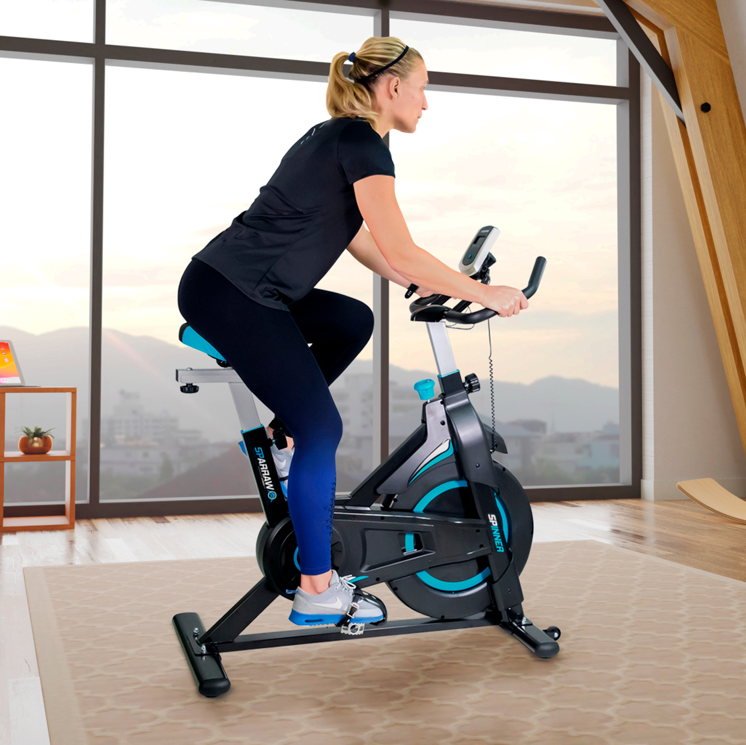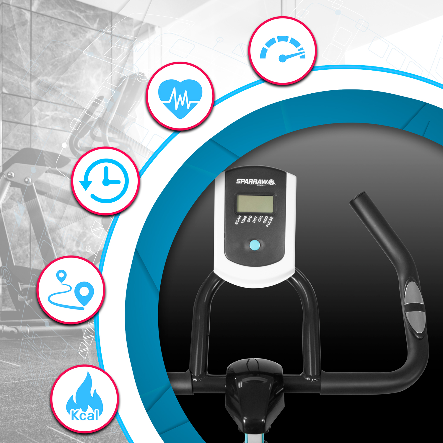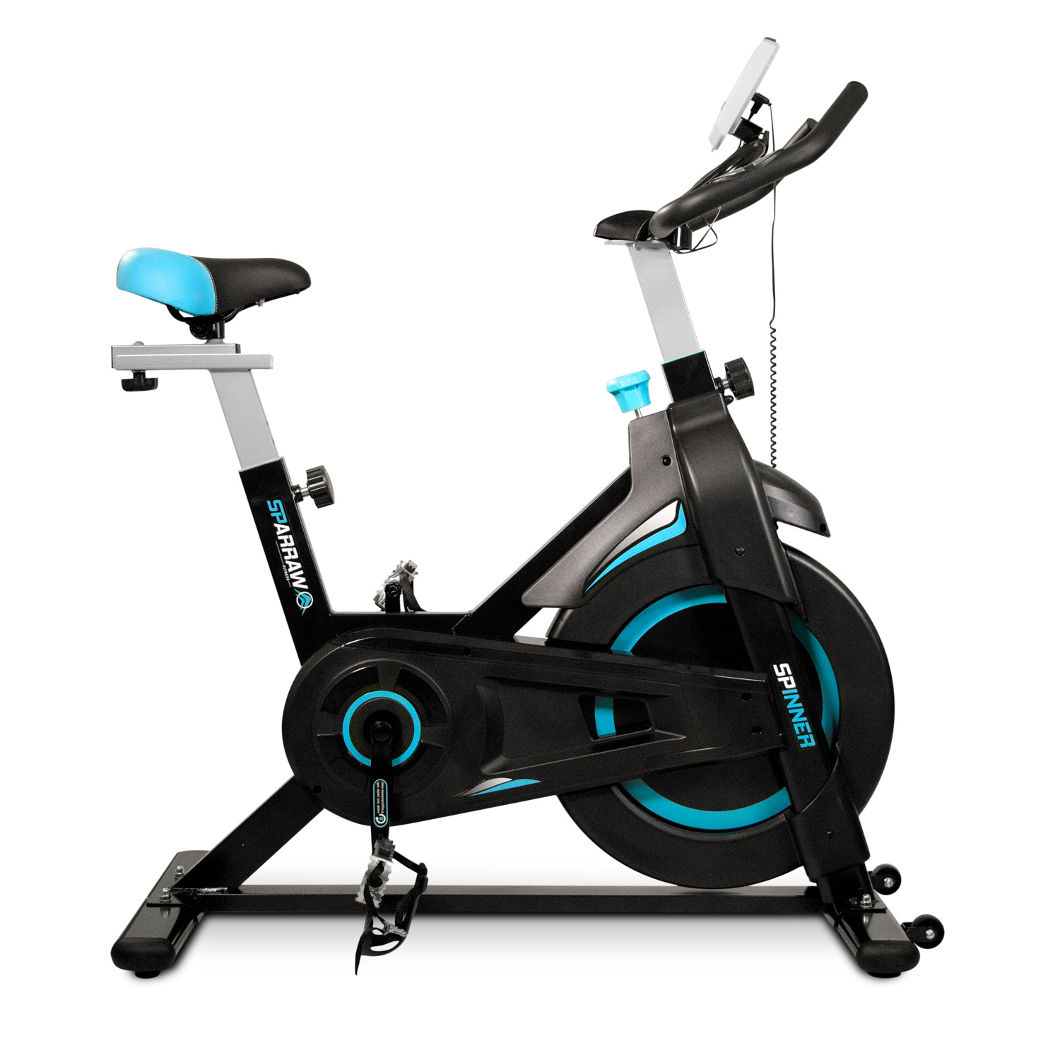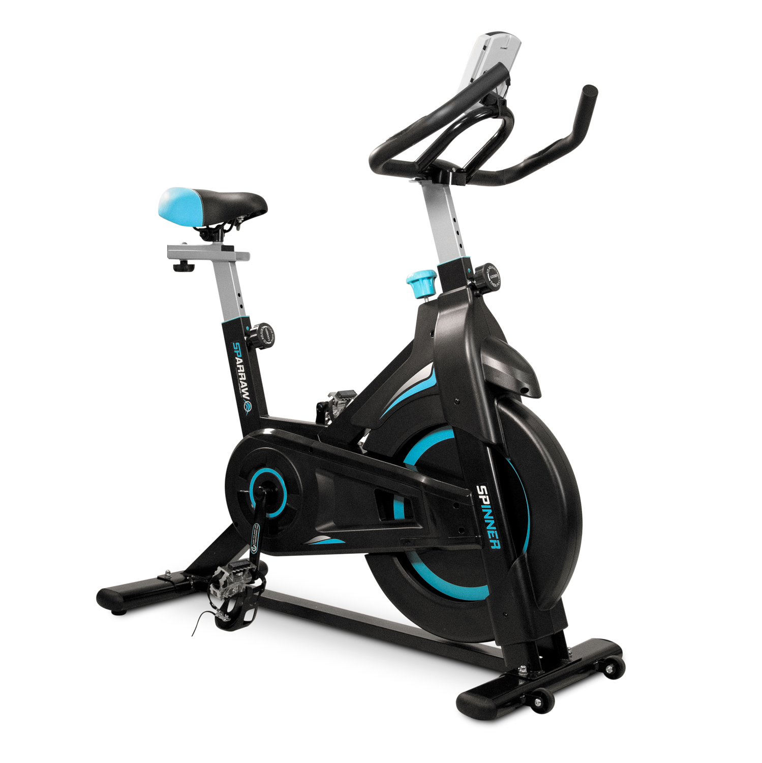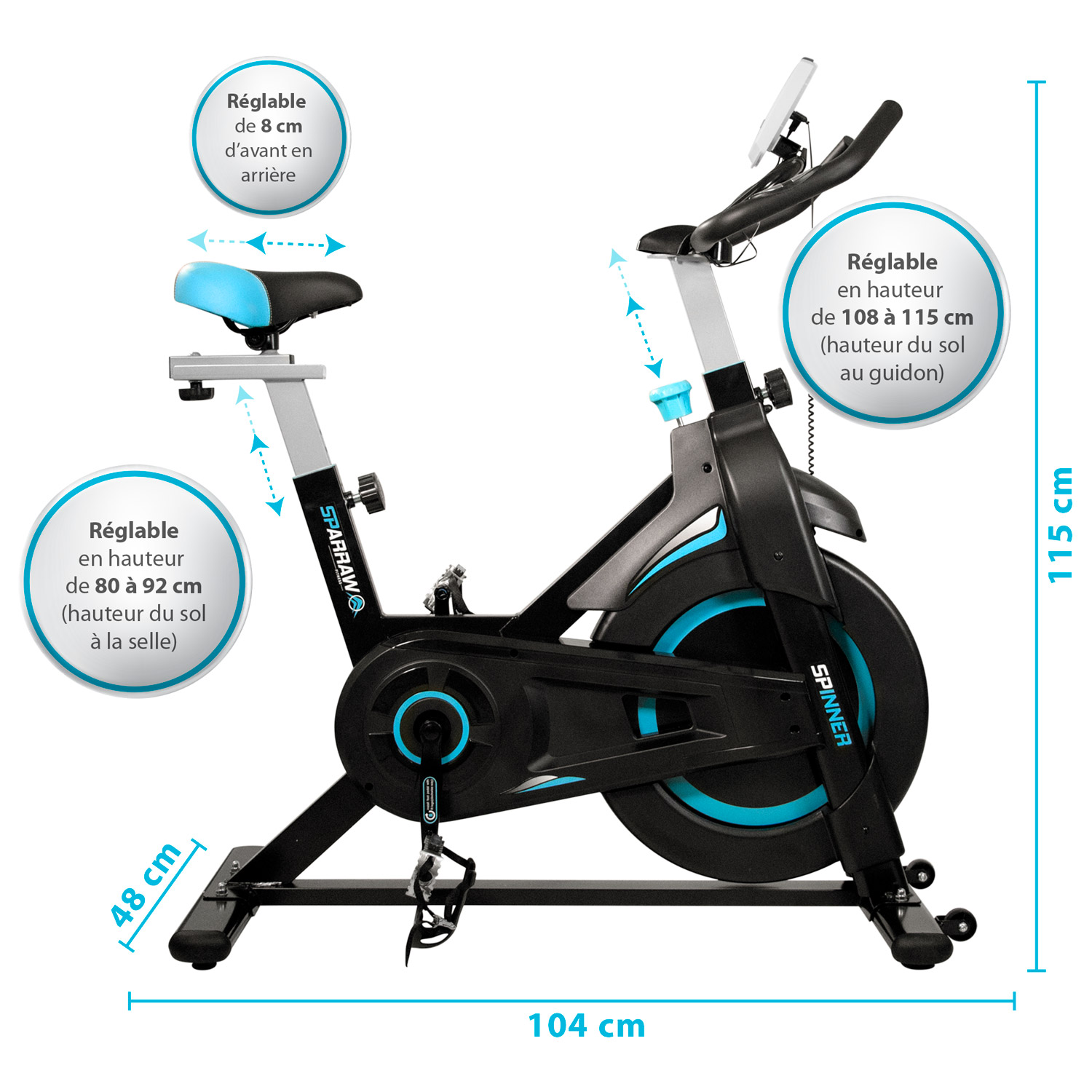 Le SPINNER de la marque SPARRAW est un vélo de spinning (appelé également RPM) doté d’un système de résistance manuelle progressif et d’une roue d'inertie de 6 kg pour un pédalage fluide et efficace. Le spinning est une activité de cardio-training, ce type d'entraînement permet de brûler des calories de manière efficace "jusqu’à 900 kcal à l'heure". Doté d'un cadre est robuste et d'une très bonne stabilité, ce vélo permet des entraînements intensifs et notamment permet de rouler en danseuse. Le SPINNER est idéal pour s’entraîner et garder la forme tout en restant à la maison. Pour un suivi efficace de vos séances, ce vélo intègre des capteurs de pouls tactiles sur le guidon et un écran LCD (fonctionne avec des piles AAA non fournies) affichant 6 fonctions principales : le temps écoulé, le nombre de kilomètres parcourus et le nombre de calories dépensées depuis le début de votre séance, la distance totale accumulée parcourue, la vitesse et la fréquence cardiaque. Pour une sécurité optimale, ce vélo dispose d'un arrêt d'urgence, en appuyant tout simplement sur la molette de résistance, vous pouvez arrêter la transmission de façon immédiate. Totalement ergonomique et confortable, le SPINNER dispose d’une selle réglable (verticalement et horizontalement), d’un guidon réglable en hauteur et de sangles réglables au niveau des pédales pour un maintien optimal lors de son utilisation. Le large choix de ces réglages permet d'adopter une position adaptée à la morphologie de l'utilisateur et ainsi d'éviter toute erreur de posture. Sa structure compacte et ses roulettes frontales permettent de le déplacer facilement d'une pièce à une autre. Dimensions Produit (L. X L. X H. Cm) : 104 X 48 X 115 Cm Poids Produit (Kg): 24 Kg Poids Roue Inertie (Kg) : 6 Kg Ecran LCD Inclus : Oui Fonctionne Sur / Piles AAA (Non Fournies) Hauteur Minimal Guidon : Hauteur Maximal Guidon : Min 108 Cm / Max 115 Cm Hauteur Minimal Selle / Hauteur Maximale Selle (Cm) : Min 80 Cm / Max 92 Cm Roulette De Déplacement : Oui Nombre De Carton(S) : 1 A Monter Soi-Même : Oui Prémonté : Oui Temps De Montage (Mn) : Environ 30 Mn Placez l’appareil sur une surface plane. Et pour une installation optimale, il est recommandé de placer un tapis de sol sous l’appareil.