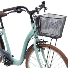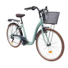 Vélo VTC 26" City Femme - Cadre Alu rigide avec enjambement bas - Fourche rigide - 7 vitesses par poignée à gâchette Microshift - Roue libre 7 vitesses - Dérailleur arrière indexé - Freins avant et arrière V BRAKE & Leviers en résine noire - Jantes aluminium & pneus marron - Panier avant - Gardes boue - Béquille - Carter - Protège dérailleur - Porte bagages - Selle confort vintage - Sonnette - Eclairage à Piles Fournies - Montage 98 % - Etiquette d'identification incluse