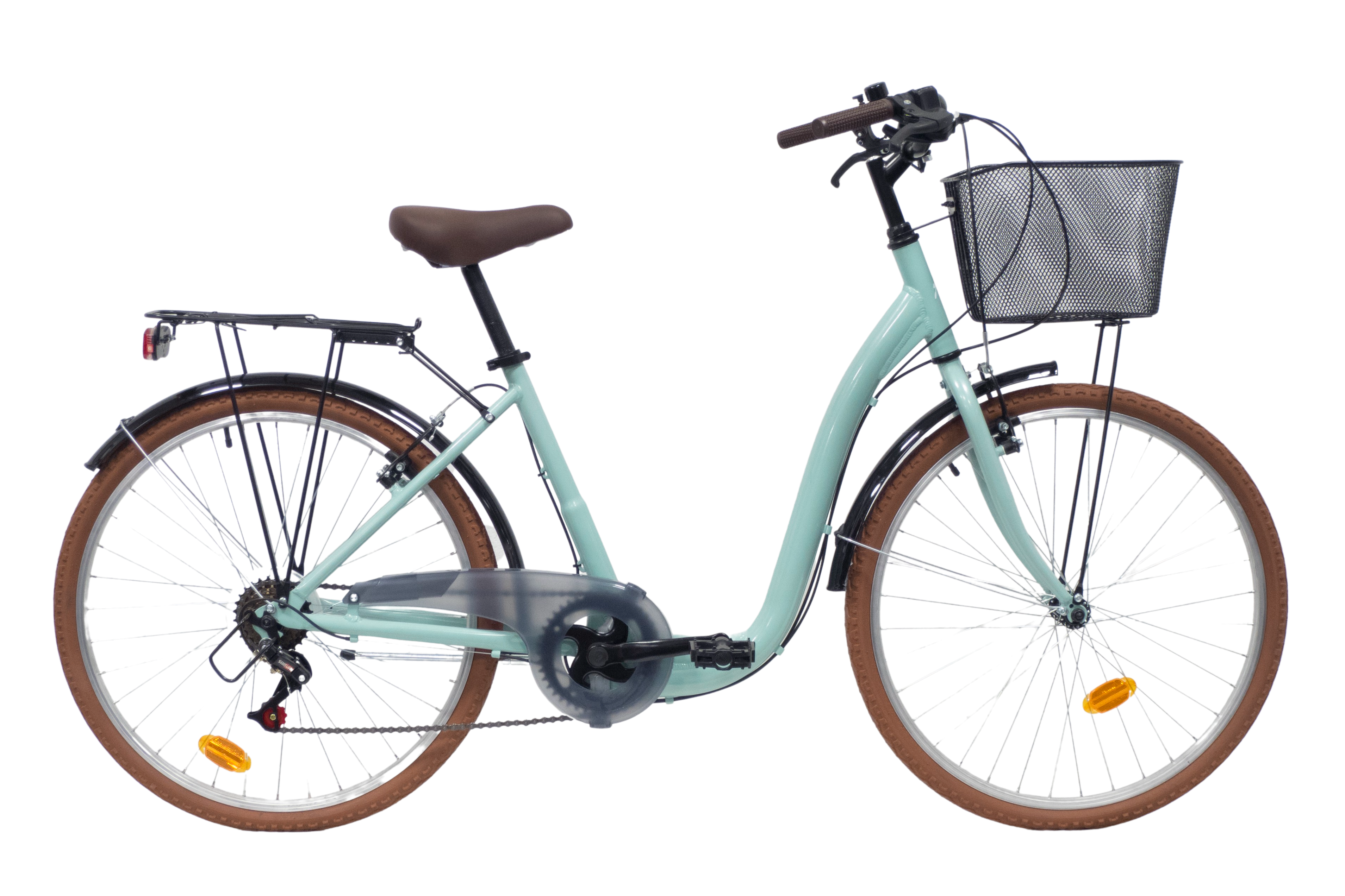Vélo VTC 26" City Femme - Cadre Alu rigide avec enjambement bas - Fourche rigide - 7 vitesses par poignée à gâchette Microshift - Roue libre 7 vitesses - Dérailleur arrière indexé - Freins avant et arrière V BRAKE & Leviers en résine noire - Jantes aluminium & pneus marron - Panier avant - Gardes boue - Béquille - Carter - Protège dérailleur - Porte bagages - Selle confort vintage - Sonnette - Eclairage à Piles Fournies - Montage 98 % - Etiquette d'identification incluse