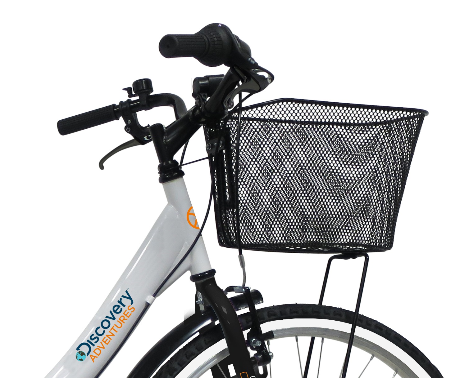 Vélo VTC 26" Discovery Adventures Femme - Cadre acier rigide avec enjambement bas - Fourche rigide - 6 vitesses via poignée tournante friction - Roue libre 6 vitesses - Dérailleur arrière Shimano TY21 - Freins avant et arrière V BRAKE en acier & Leviers en résine noire - Jantes aluminium & pneus noirs et blanc - Panier avant - Gardes boue - Béquille - Carter - Protège dérailleur - Porte bagages - Selle confort avec attache rapide - Sonnette - Eclairage à Piles Fournies - Monté à 98% - Taille 46 cm - Convient aux personnes ayant une taille comprise entre 1.60 m et 1.75 m « Vous avez un cycle dans votre panier. Nous vous informons qu’afin de respecter l’obligation légale d’identification des cycles, des données à caractère personnel doivent nous être transmises : - Adresse mail/ Téléphone Le recueil des données personnelles est cependant limité aux seules informations nécessaires permettant d’identifier et de contacter le propriétaire pour lui restituer son cycle en cas de vol. Afin de vous expédier v
