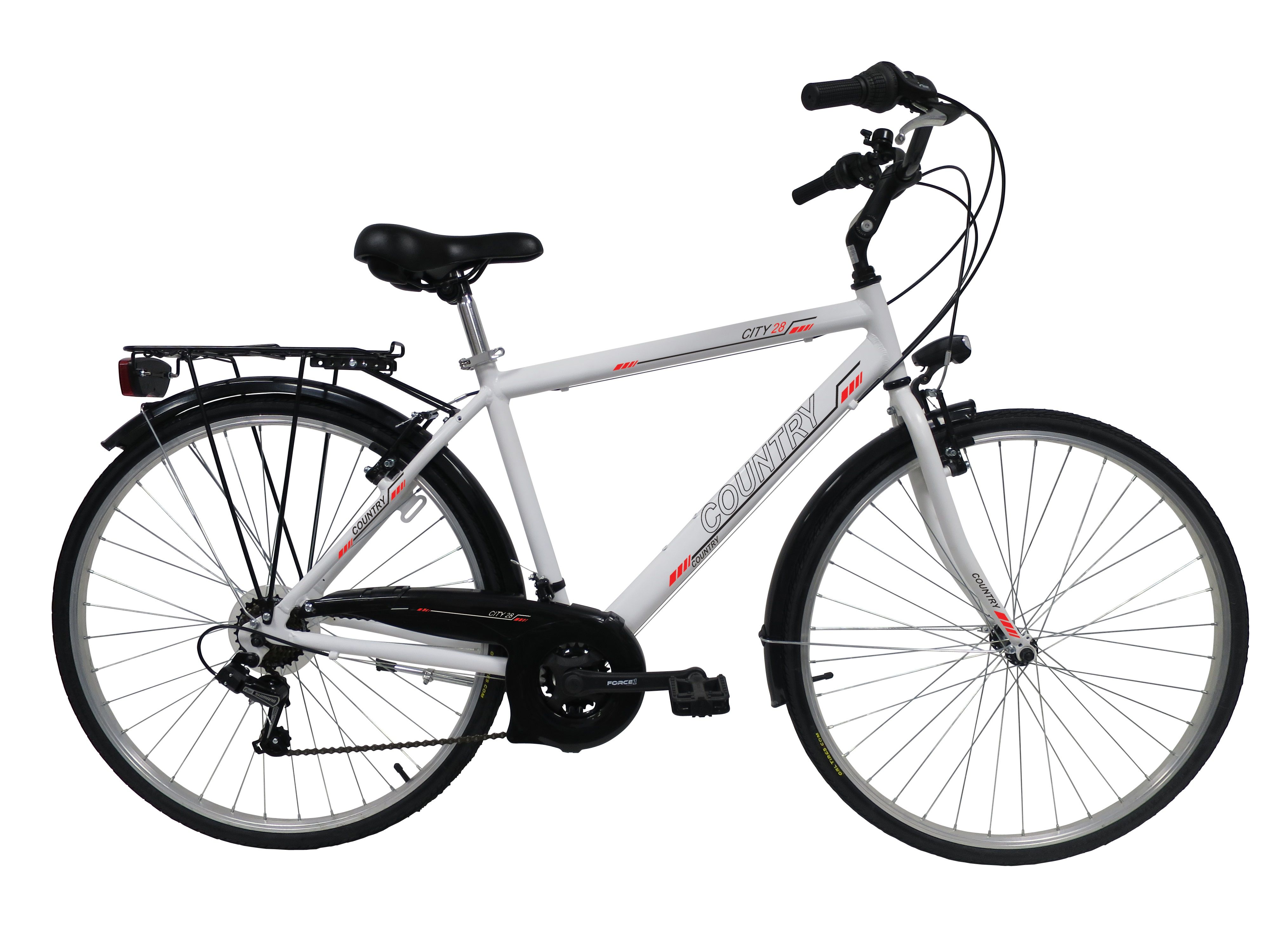 VTC 28 Country Homme - Cadre alu rigide - Fourche rigide - 21 vitesses par poignées tournantes Revoshift Shimano - Freins avant et arrière V BRAKE avec étriers & Leviers aluminium - Dérailleur arrière TY21 et avant Shimano TZ30 - Potence réglable - Jantes aluminium & pneus noirs - Gardes boue - Porte bagages - Béquille - Carter - Selle confort - Sonnette - Eclairage à piles fournies.