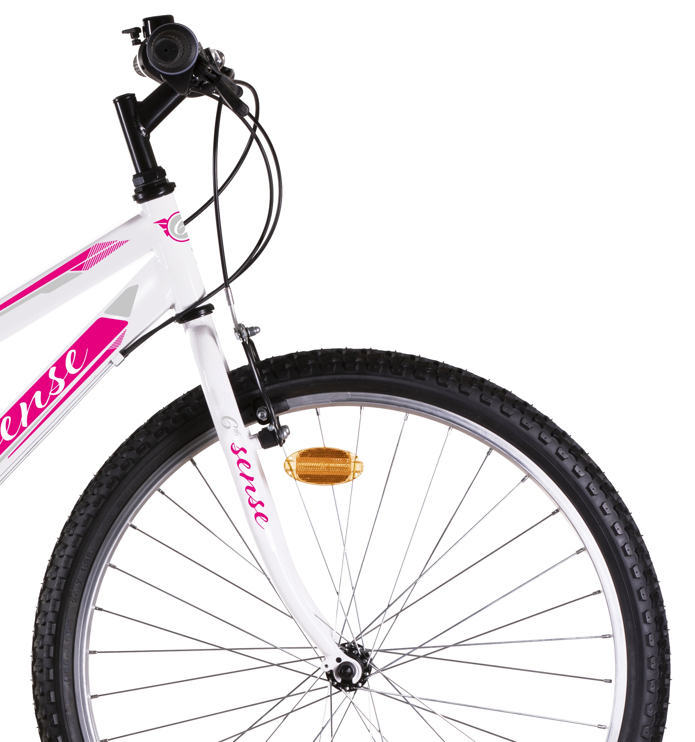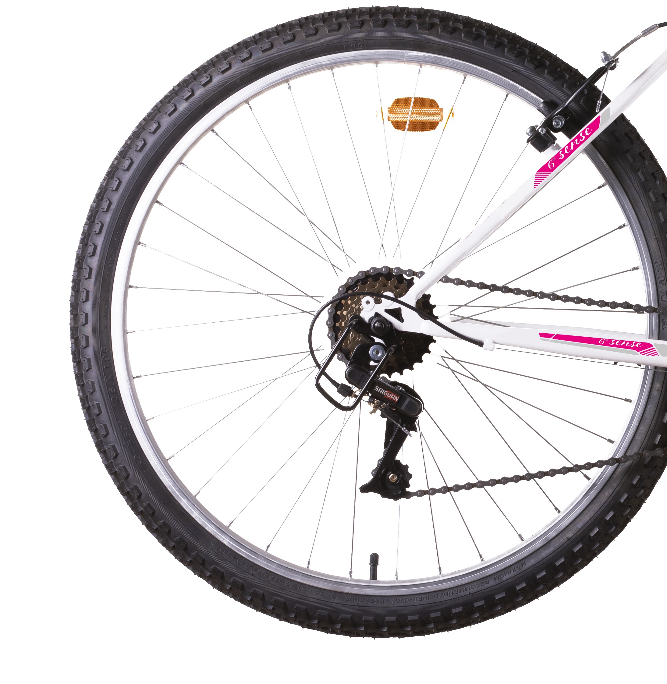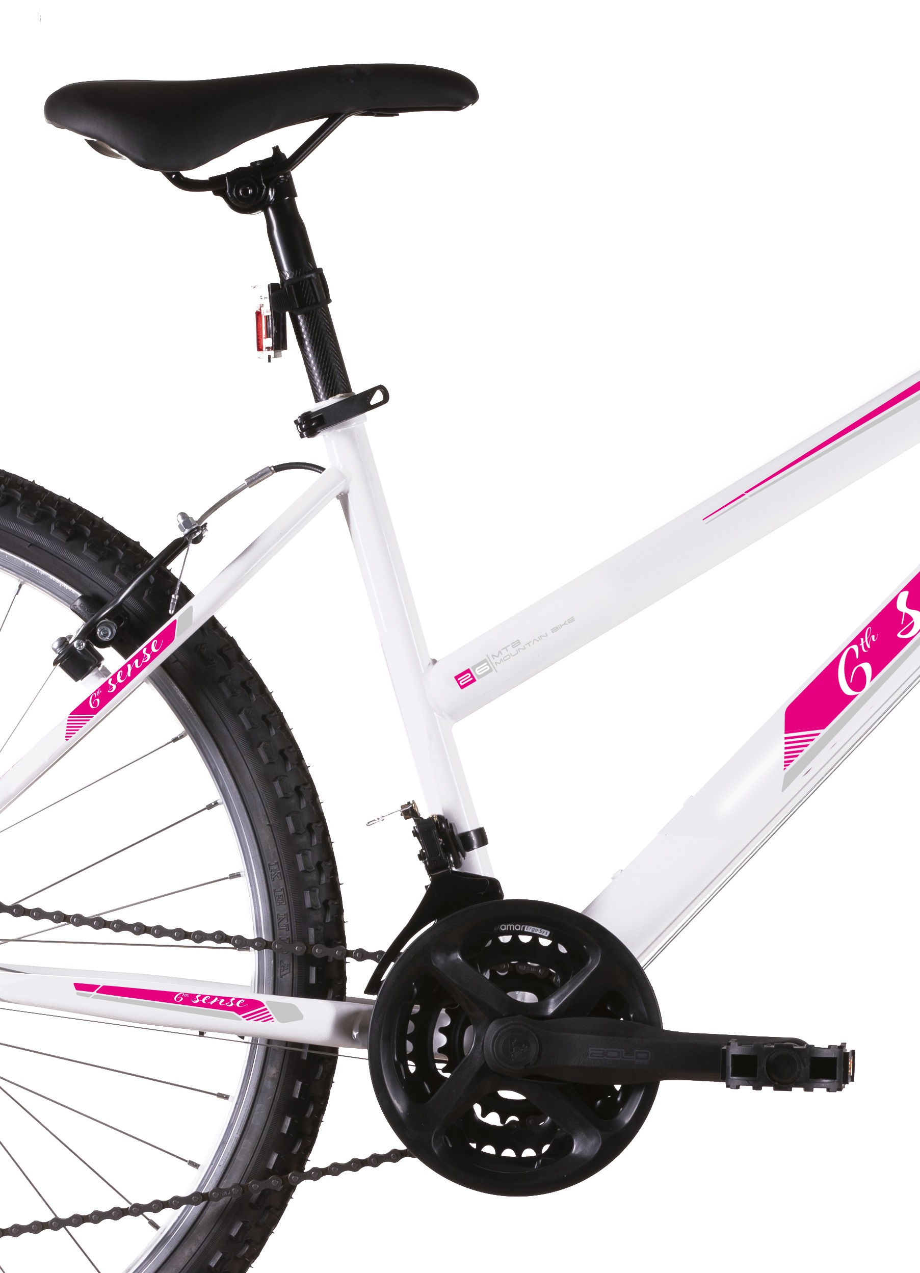 VTT 26 6ème Sense Femme - Cadre acier rigide - Fourche rigide - 18 vitesses indexées par poignées tournantes - Dérailleur arrière indexé - Potence plongeur - Freins avant et arrière V BRAKE avec étriers acier & Leviers en résine noire - Jantes aluminium avec attache rapide avant & pneus noirs - Blocage rapide tige de selle - Sonnette - Eclairage à piles fournies