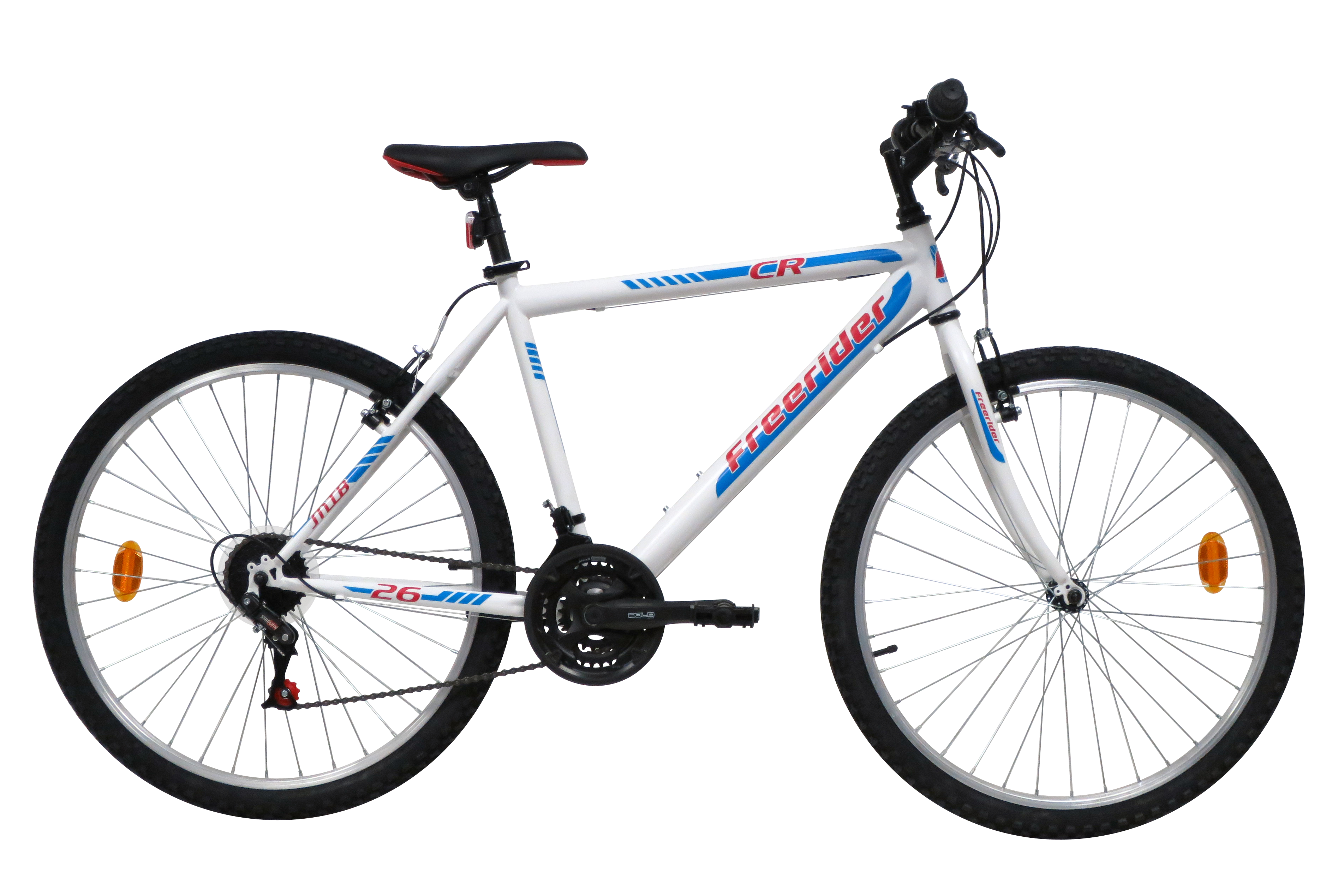 Vélo VTT 26" CR/Freerider Homme - Cadre acier rigide - Fourche rigide - 18 vitesses indexées par poignées tournantes - Dérailleur arrière indexé - Potence plongeur - Freins avant et arrière V BRAKE avec étriers acier & Leviers en résine noire - Jantes aluminium avec attache rapide avant & pneus noirs - Blocage rapide tige de selle - Sonnette - Eclairage à piles fournies