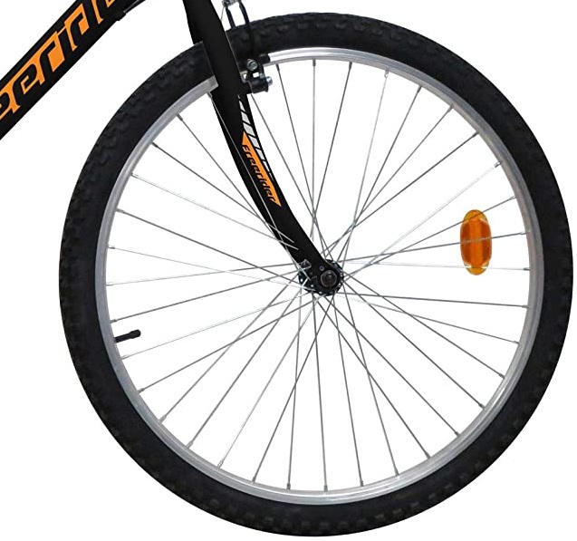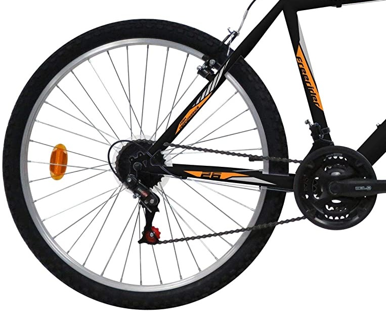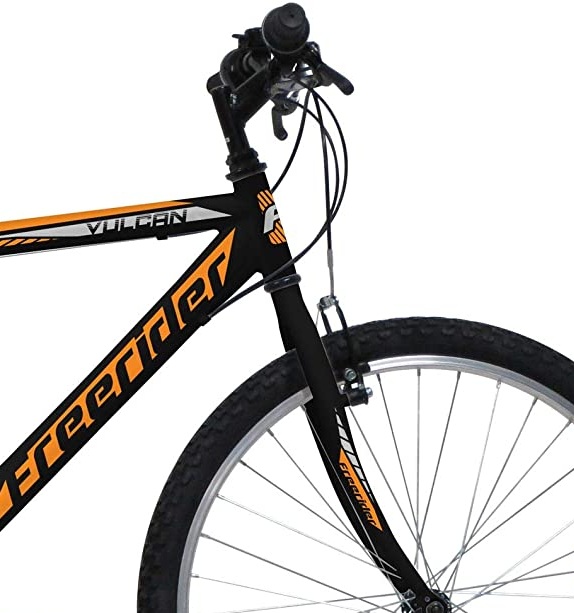 VTT 26" Vulcan/Freerider Homme - Cadre acier rigide - Fourche rigide - 18 vitesses par poignées tournantes - Dérailleur arrière indexé - Potence plongeur - Freins avant et arrière V BRAKE avec étriers acier & Leviers en résine noire - Jantes aluminium avec attache rapide avant & pneus noirs - Blocage rapide tige de selle - Sonnette - Eclairage à piles fournies.