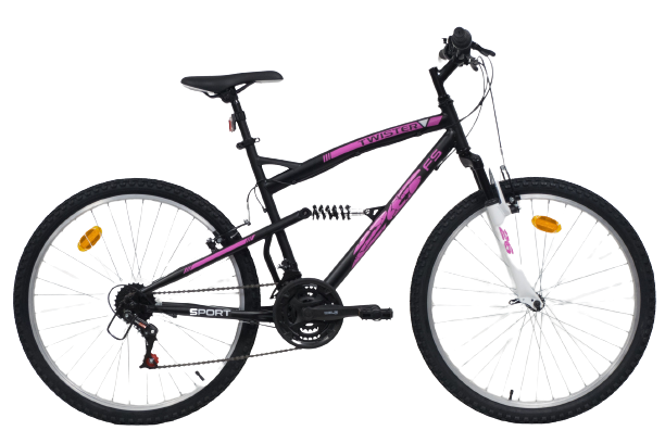 Vélo VTT 26'' Twister tout suspendu Femme - Cadre en acier - Fourche télescopique - 18 Vitesses par poignées tournantes - Roue libre 6 vitesses - Dérailleur arrière Indexé - Potence plongeur - Freins avant & arrière V-Brake - Jantes aluminium avec attache rapide avant - Pneus noirs - Selle avec blocage rapide - Sonnette - Eclairage à piles fournies. Type de montage Livré monte à 85% / Roue avant et selle à positionner, Guidon à repositionner + Pédales à fixer.