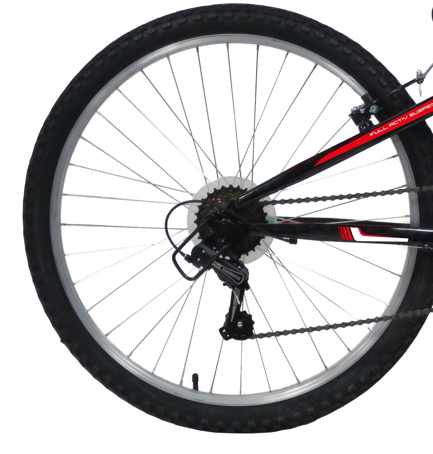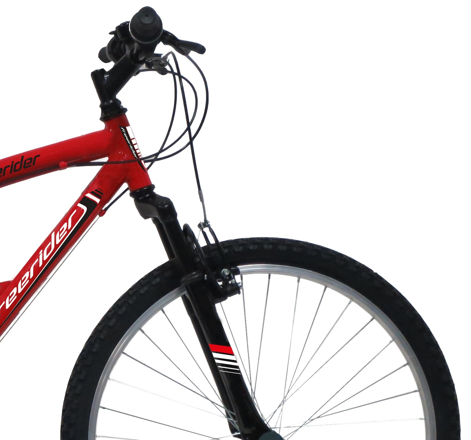 Vélo VTT 26'' Freerider tout suspendu Homme - Cadre rigide oversize en acier - Fourche télescopique - 18 Vitesses par poignées tournantes Shimano Revoshift - Roue libre indexée - Dérailleur arrière TY21 Shimano - Protège dérailleur - Potence plongeur - Freins V-Brake avec étriers en acier et levierse en Aluminium - Jantes aluminium avec attache rapide avant - Pneus noirs - Selle avec blocage rapide - Sonnette - Eclairage à piles fournies