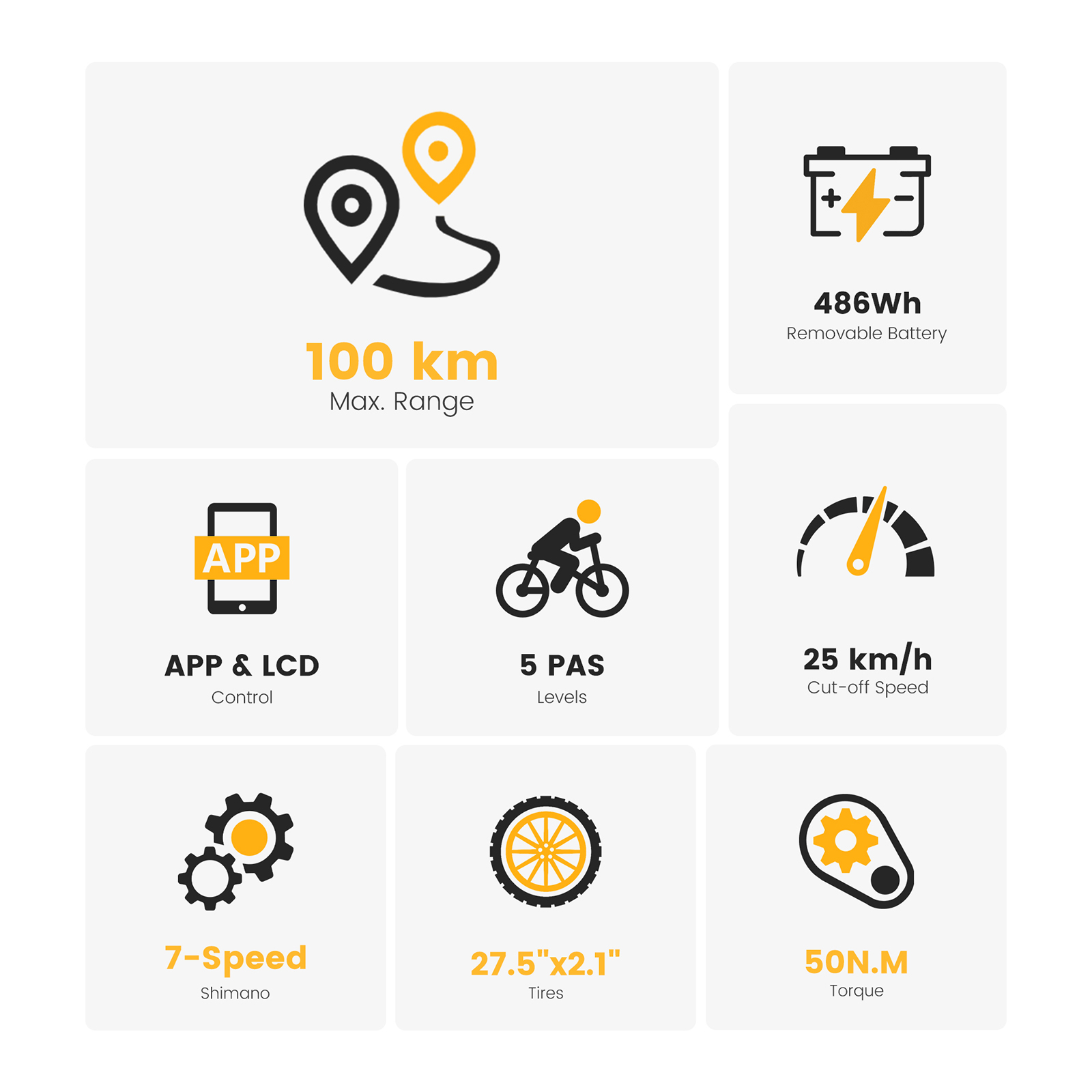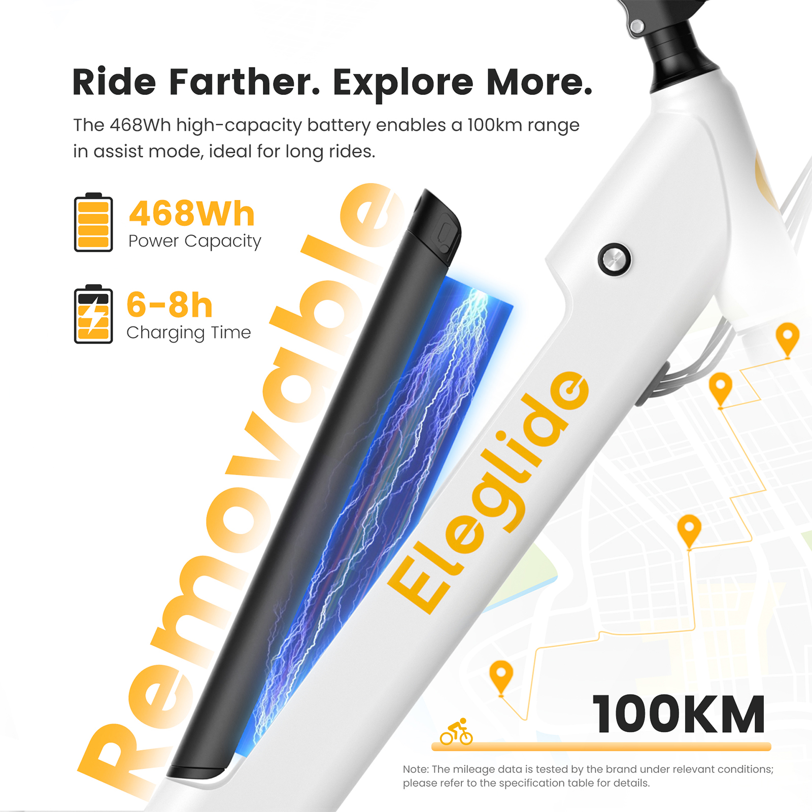 Eleglide T1 Step-Thru comprend un puissant moteur sans balai de 250 W avec un couple de 50 Nm qui vous fournit une puissance constante et puissante et permet au vélo d'atteindre une vitesse de 25 km/h. Avec une batterie lithium-ion remplaçable de 468 Wh, il peut parcourir jusqu'à 100 km (62 mi) en mode assistance, ce qui est parfait pour vos longs trajets.