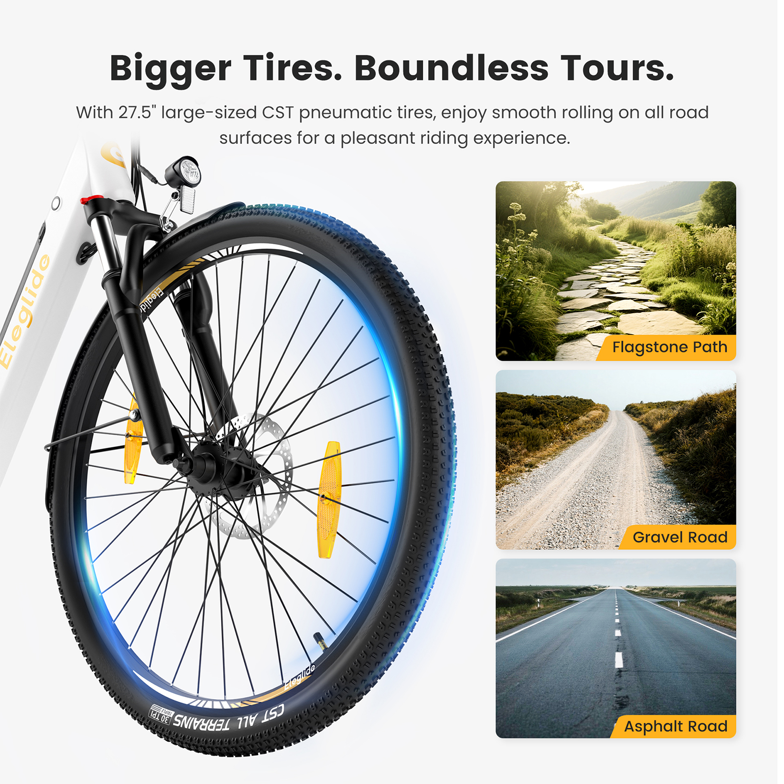 Pneus CST 27,5"Le vélo Eleglide T1 Step-Thru est équipé de pneus pneumatiques CST de 27,5 pouces qui peuvent s'adapter à une variété de surfaces de route. Avec de gros pneus, il peut passer en douceur et facilement sur les bosses.