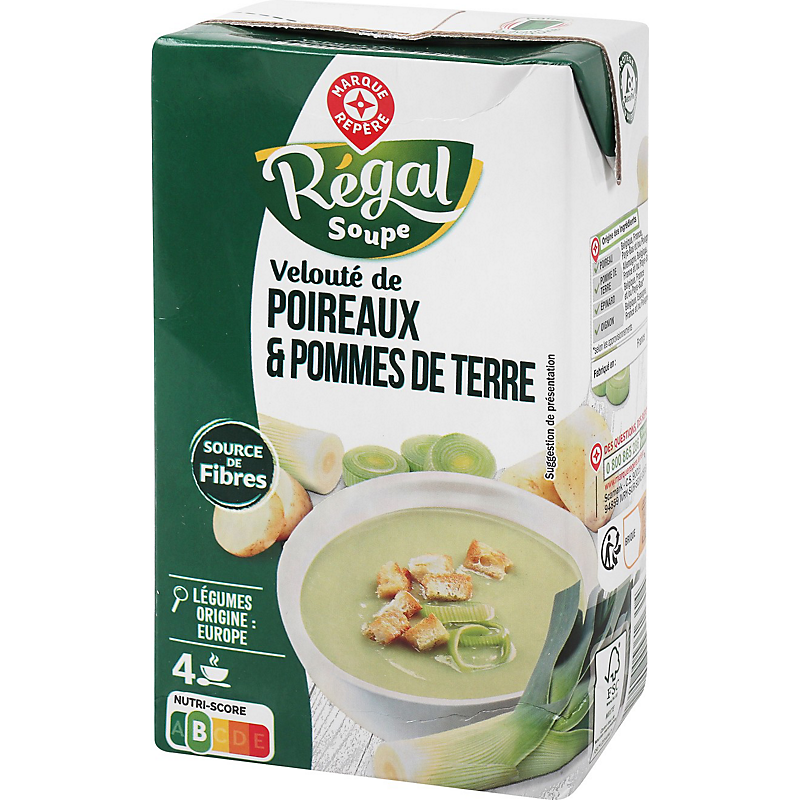 | Origine des principaux ingrédients | POIREAU ORIGINE : BELGIQUE, FRANCE, PAYS-BAS ET/OU POLOGNE*, POMME DE TERRE ORIGINE : ALLEMAGNE, BELGIQUE, FRANCE ET/OU PAYS-BAS*, EPINARD ORIGINE : BELGIQUE, FRANCE ET/OU PAYS-BAS*, OIGNON ORIGINE : BELGIQUE, ESPAGNE, FRANCE ET/OU POLOGNE* * SELON LES APPROVISIONNEMENTS ET/OU LES CARACTÉRISTIQUES GUSTATIVES RECHERCHÉES |