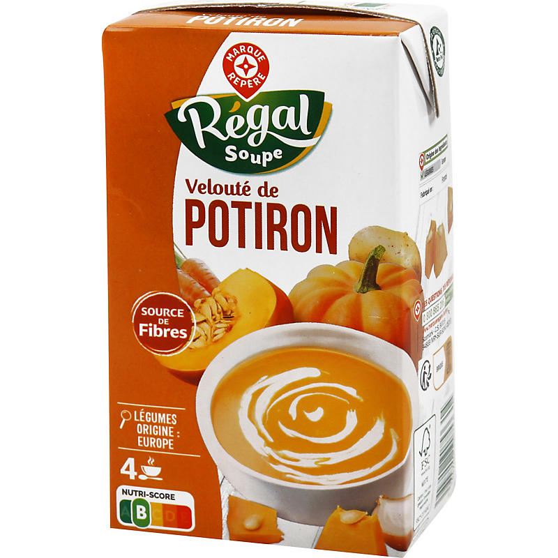 Ingrédients : Eau, potiron 30,5 %, carotte 8,7 %, pomme de terre 7,5 %, oignon 5 %, jus de tomate à base de concentré 4 %, crème 2,5 %, amidon modifié de maïs, beurre, sucre, sel, extrait de levure.