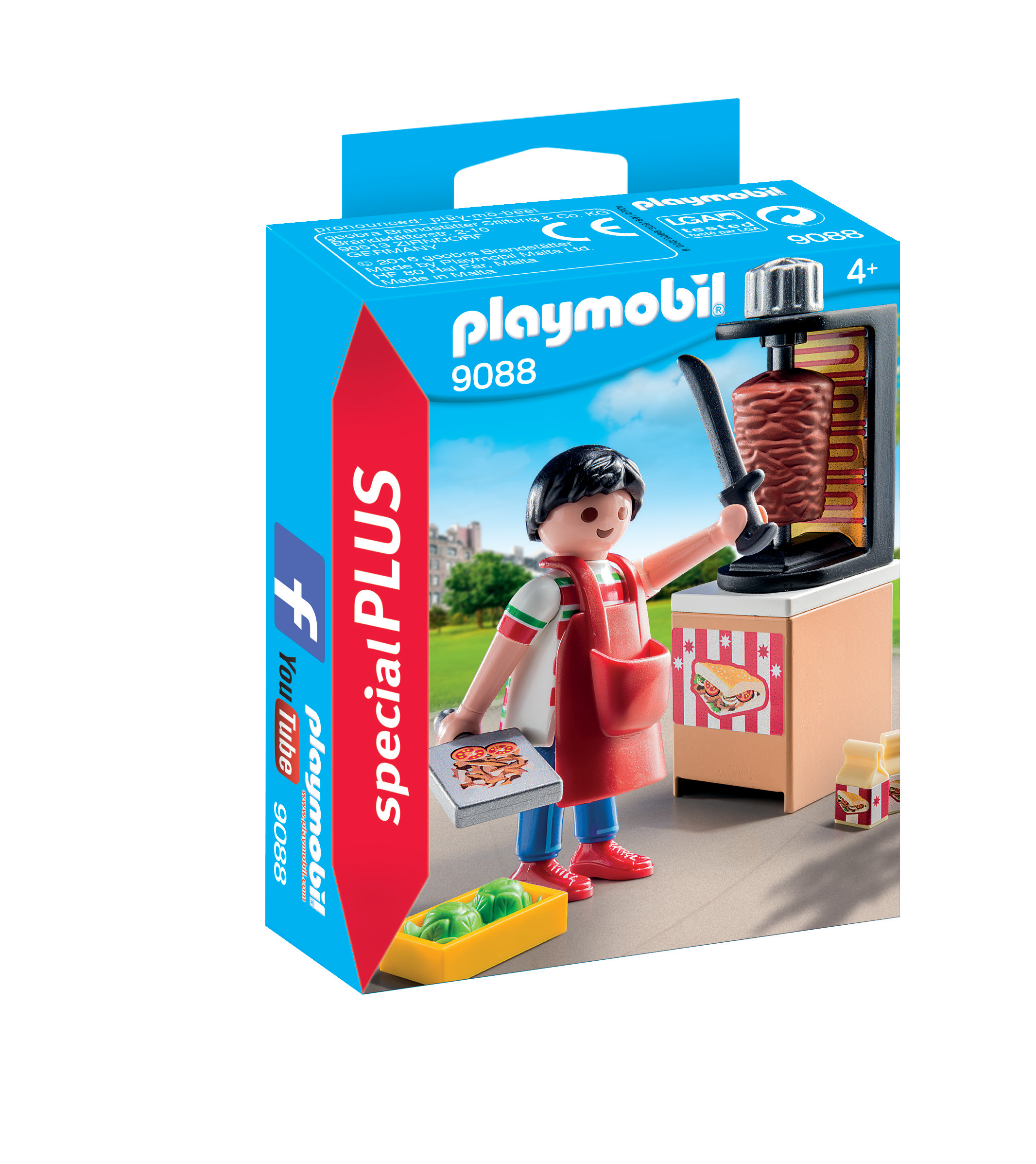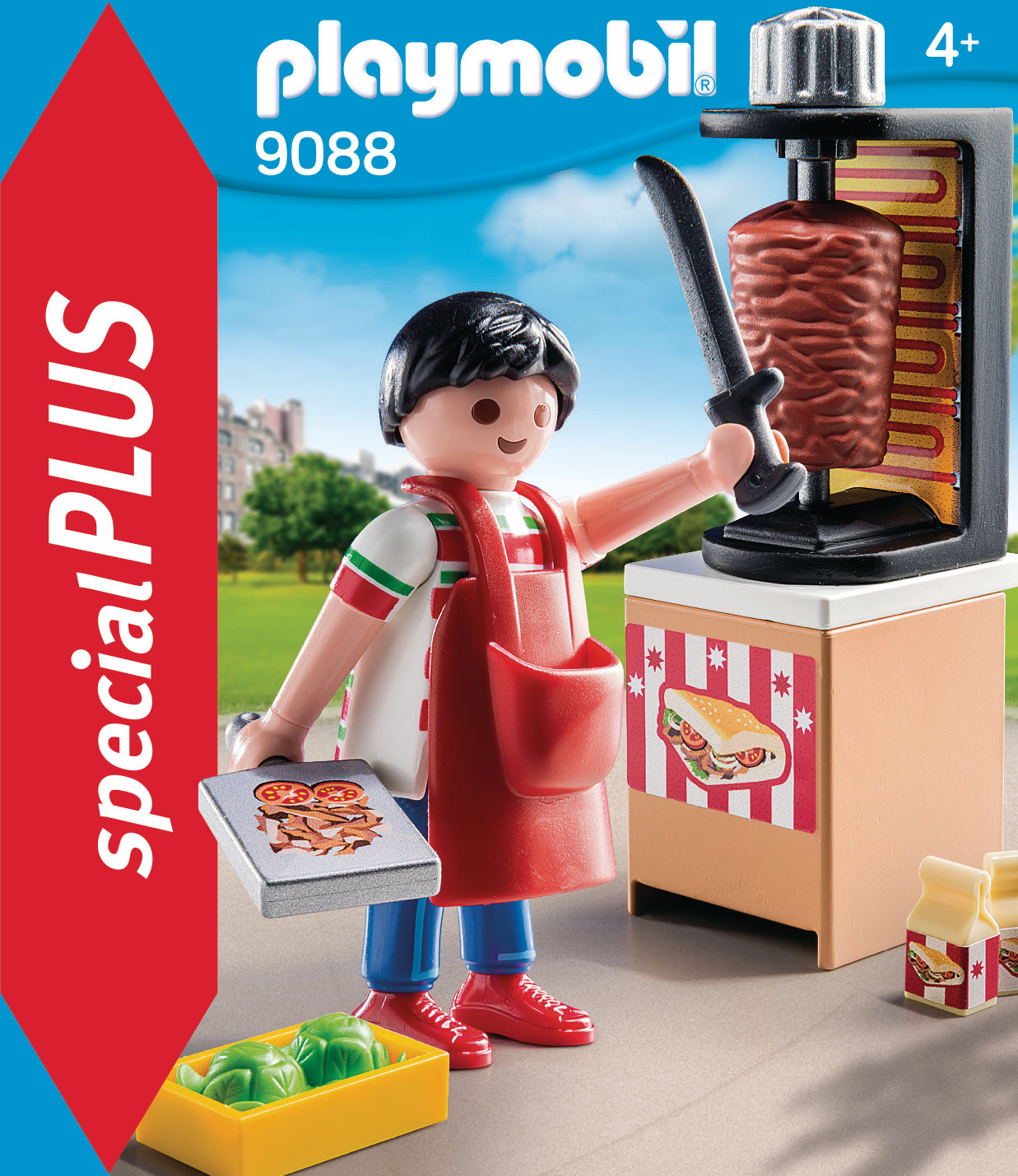 Faim ? Soif ? Vite ! Allons chez le vendeur de kebab. Il propose de délicieux sandwichs, fraîchement tranché de la broche, mais aussi des boissons fraîches. Contient un personnage et des accessoires.