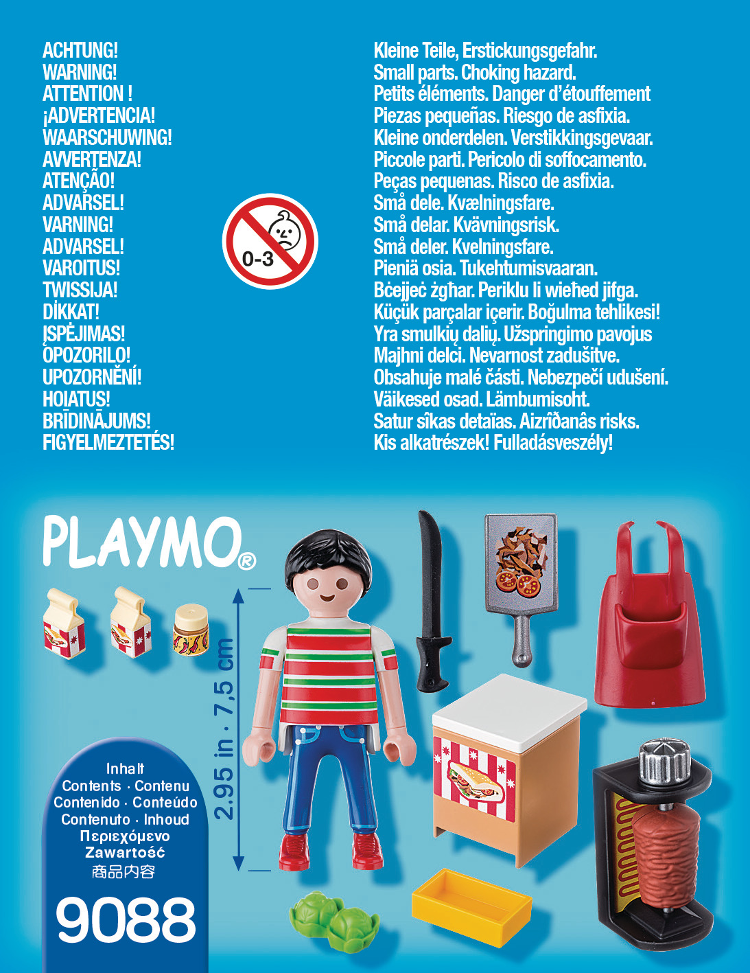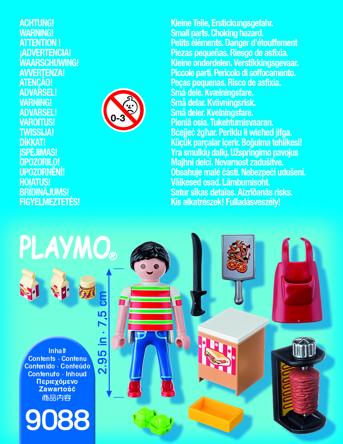 | La boîte contient | Contient 1 personnage, 1 machine à kebab, 1 tablier, 1 table et des accessoires (nourriture, couteau, planche) |