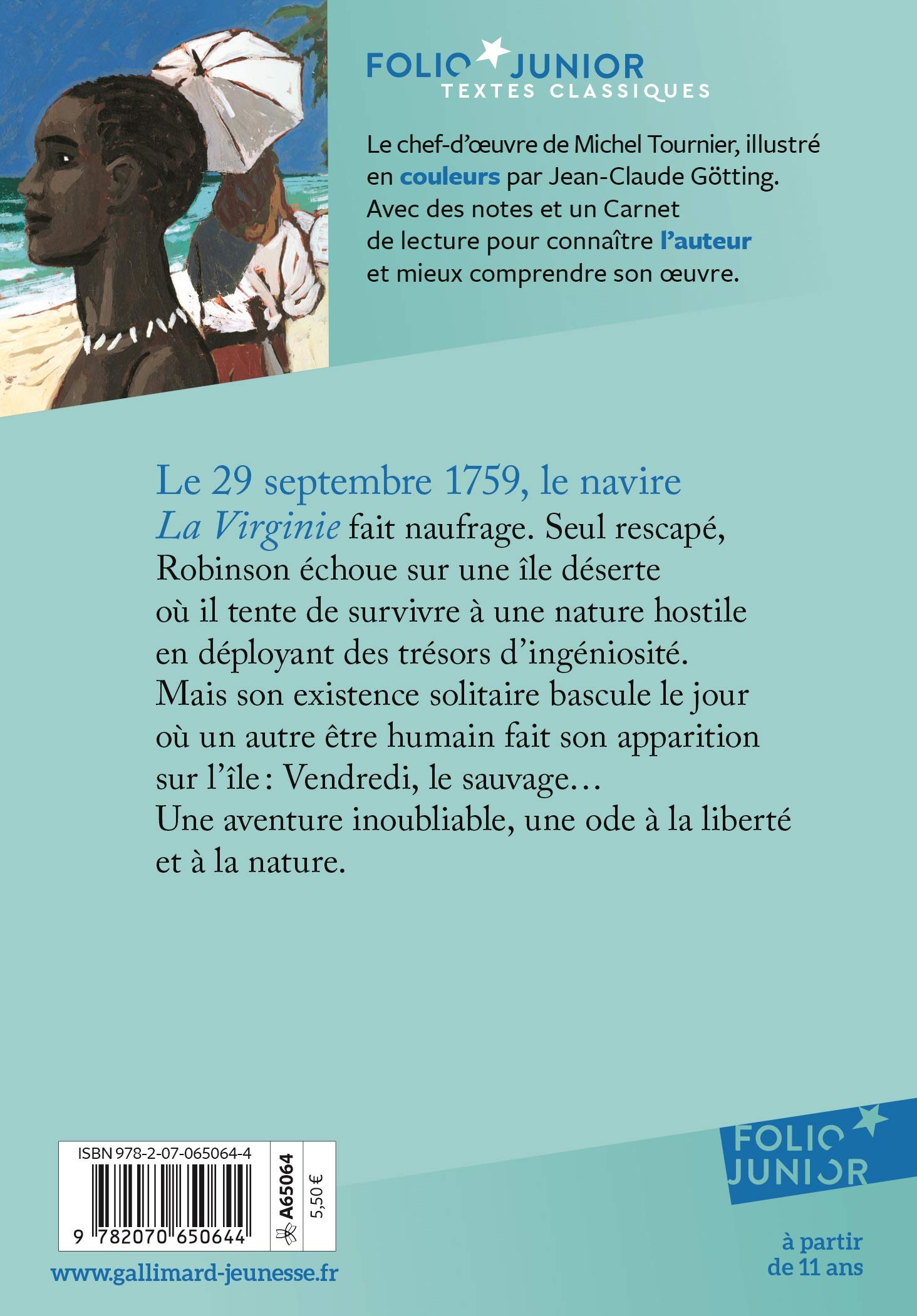 Le 29 septembre 1759, le navire " La Virginie" fait naufrage. Seul rescapé, Robinson échoue sur une île déserte où il tente de survivre à une nature hostile en déployant des trésors d'ingéniosité. Mais son existence solitaire bascule le jour où un autre être humain fait son apparition sur l'île : Vendredi, le sauvage... . Titre recommandé par l'Éducation nationale en classe de 6e et 5e