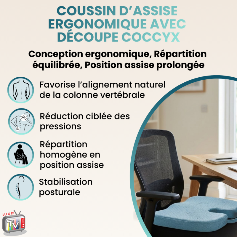 • Soutien ergonomique ciblé : le coussin d'assise ergonomique avec découpe coccyx réduit les pressions localisées, favorise un alignement postural stable et améliore le confort lors des positions assises prolongées sur chaise de bureau, fauteuil ou siège de travail.