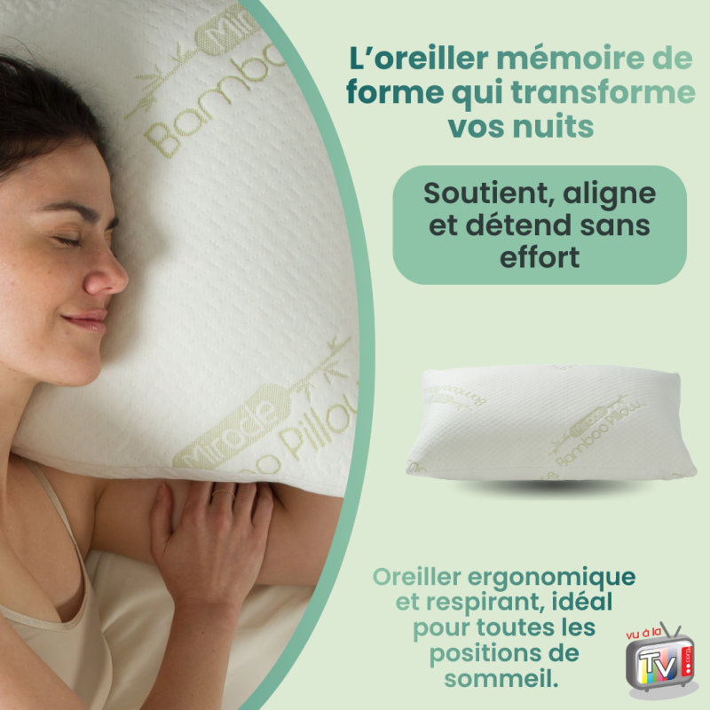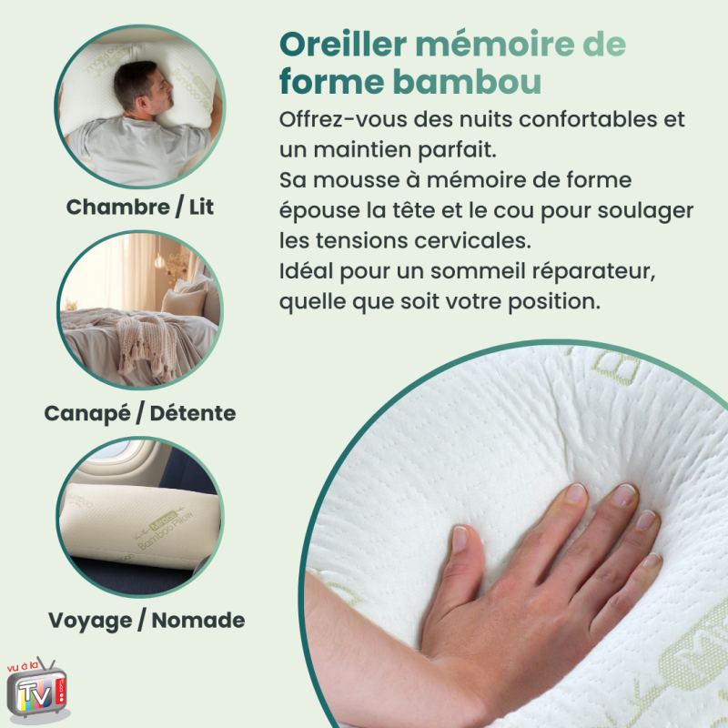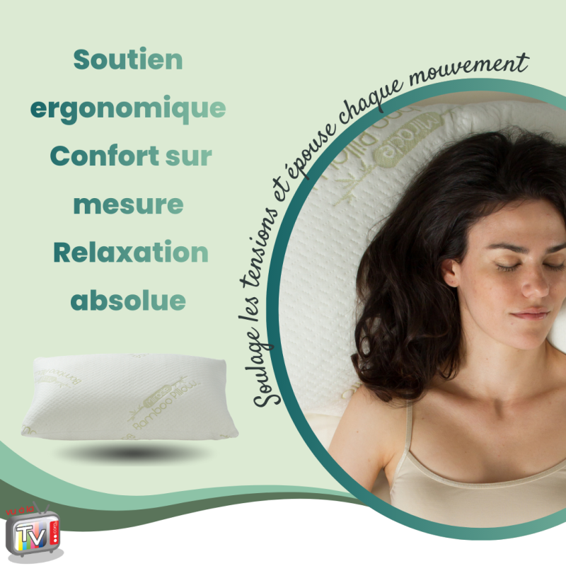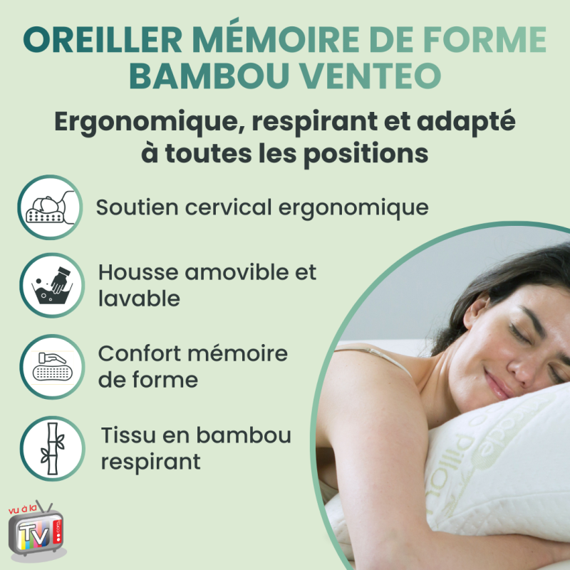- Oreiller Mémoire Forme Venteo : oreiller ergonomique en bambou respirant, conçu pour offrir un confort absolu et un soutien naturel du cou et de la tête pendant le sommeil. Sa mousse innovante s'adapte à toutes les positions pour un repos durable et réparateur.