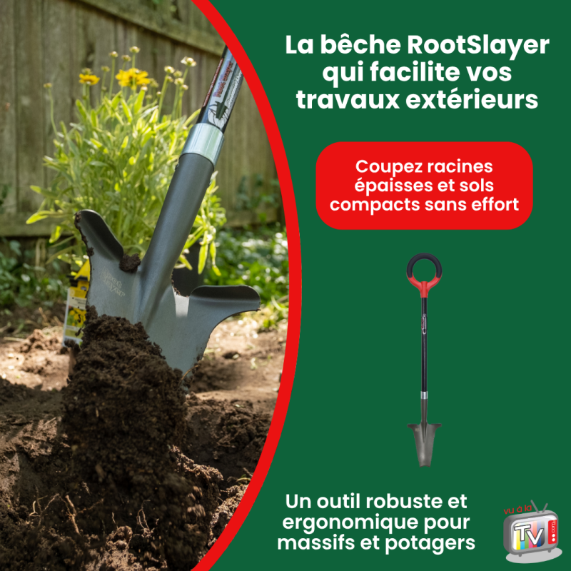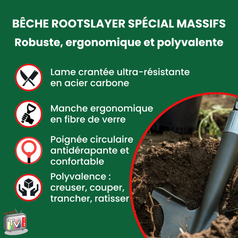 La Bêche Spécial Massifs RootSlayer Venteo est conçue pour travailler avec précision dans les massifs, bordures et zones étroites du jardin.