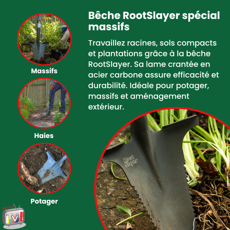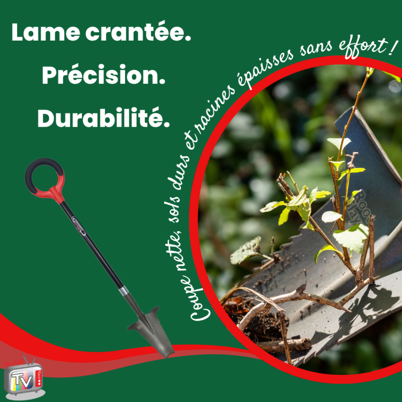 - Coupe efficace des racines : la lame étroite dentée en acier carbone agit comme une scie pour sectionner facilement les racines et pénétrer les sols compacts.