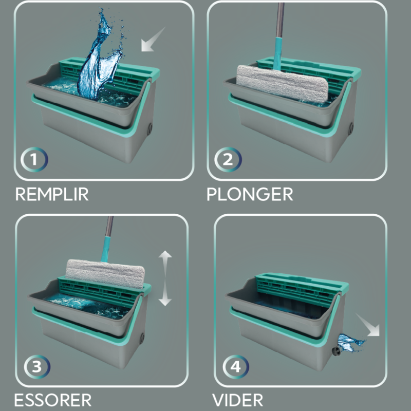 Que ce soit du carrelage, du parquet, du lino ou encore des surfaces plus délicates, ce balai s'adapte à tous les types de sols. Sa tête large et articulée, combinée à une housse en microfibre lavable, garantit un nettoyage impeccable sans abîmer vos surfaces. - SYSTÈME DE SEAU INTELLIGENT À 2 COMPARTIMENTS AVEC ESSORAGE INTÉGRÉ