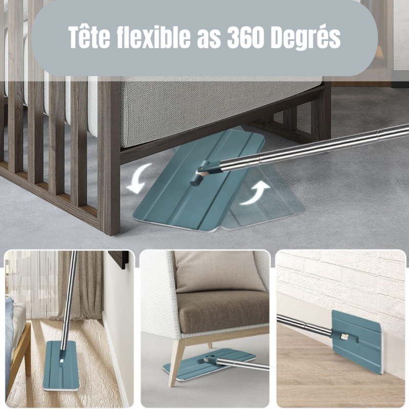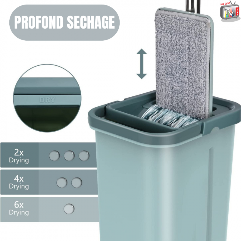 - • Seau à double compartiment – Essorage et rinçage séparés pour un nettoyage mains libres, plus hygiénique et rapide. Le système permet d'avoir en permanence une serpillière propre, prête à l'emploi.