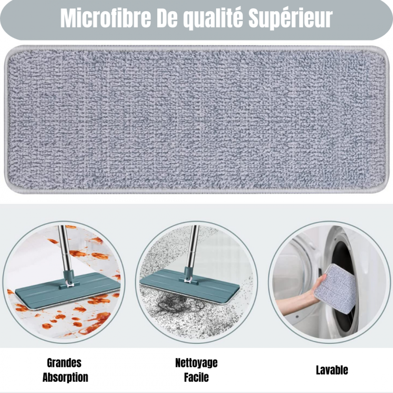 - • Microfibre absorbante – Retient l'humidité, les taches et les poussières dès le premier passage. Ce tissu haute densité assure un nettoyage en profondeur, sans rayer les surfaces délicates.