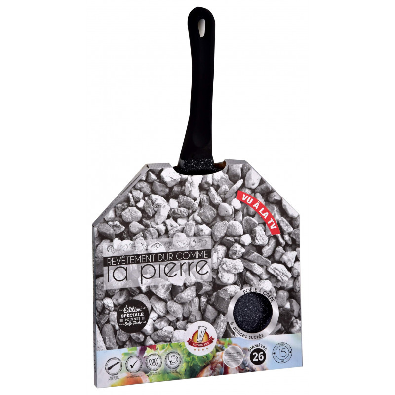 - Fabriquée dans des matériaux résistants, la poêle à crêpes KITCHEN PRO™ poignée SOFT-TOUCH est garantie 15 ans. Elle s'utilise sur tous types de feux : gaz, électrique, vitrocéramique et induction. Elle est également facile à nettoyer.