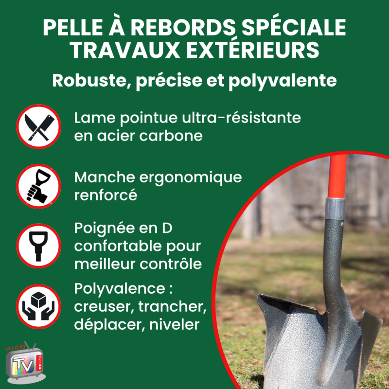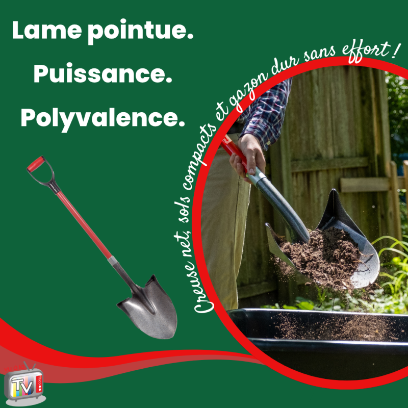 - Robustesse et efficacité : lame en acier carbone trempé avec rebords, conçue pour résister aux travaux intensifs et pénétrer les sols durs avec précision. Idéale pour creuser tranchées, ameublir la terre ou réaliser des aménagements exigeants.