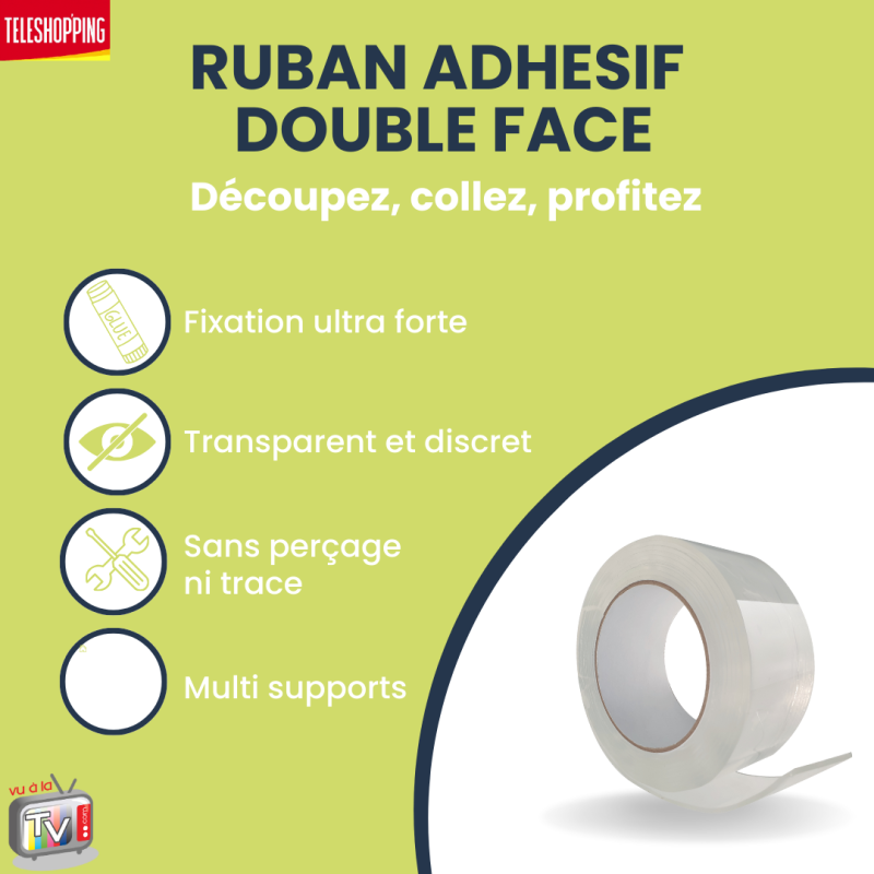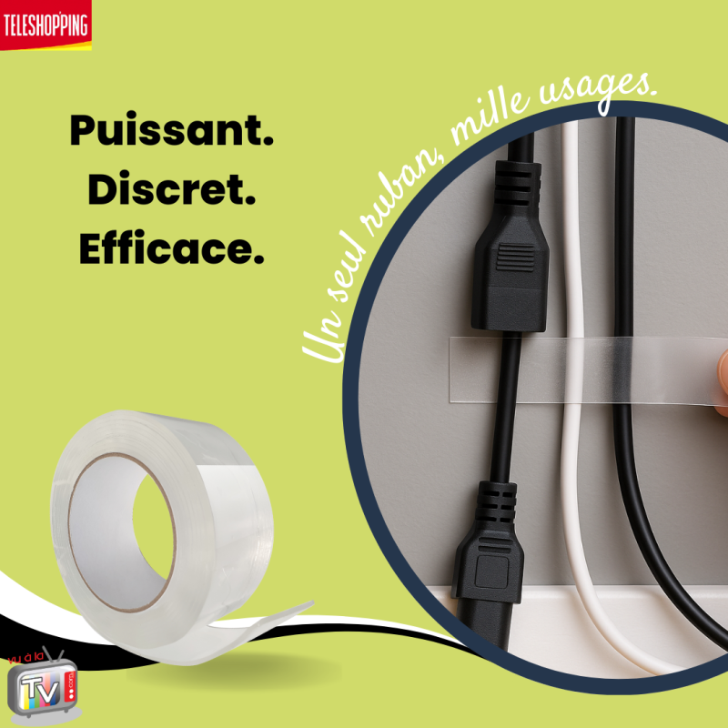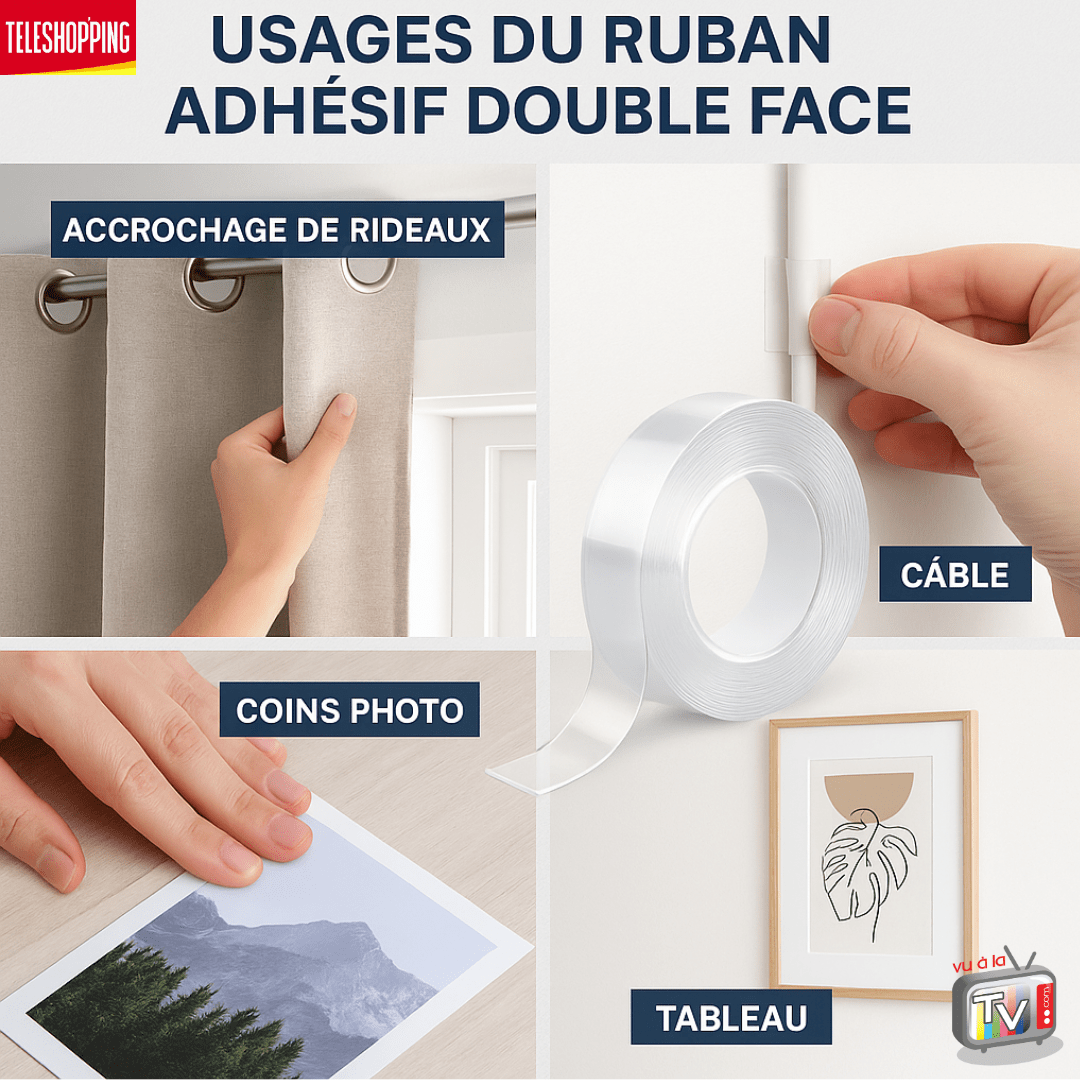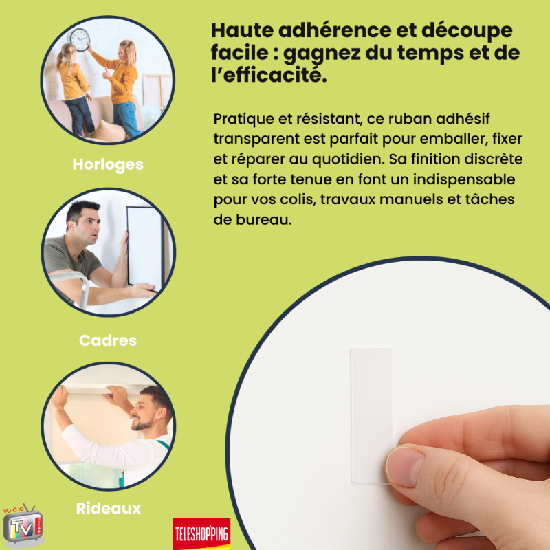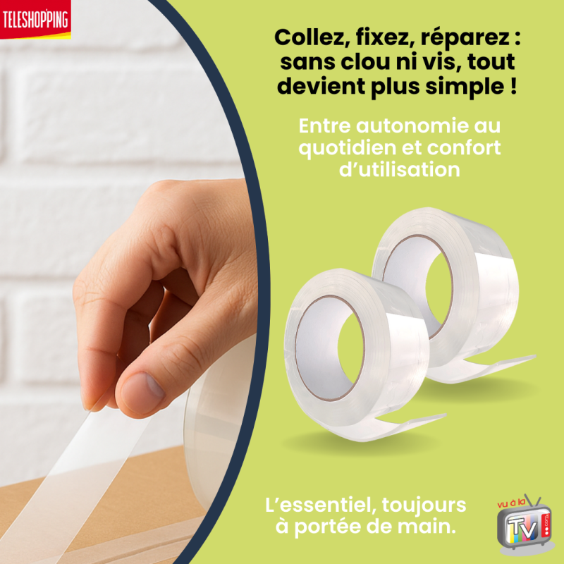 Transparent et discret : Contrairement au gros scotch classique, ce ruban adhésif double face est invisible et s'adapte à toutes les surfaces : bois, métal, papier peint, tissu, plastique ou verre...