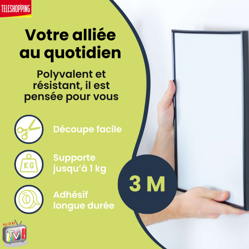 Pratique et réutilisable : Livré en rouleau facile à découper au mètre, il s'adapte à toutes vos utilisations. Fixez et repositionnez vos objets en quelques secondes, sans perçage ni outils, et retirez-le sans abîmer peinture, papier peint ou support mural.