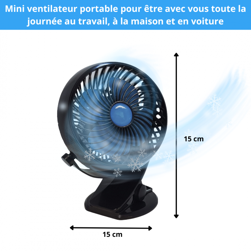- Grâce à son clip intégré il vous laisse les mains libres. La tête du ventilateur pivote à 360°degré. Vous resterez au frais en haut, en bas, à gauche, à droite, devant et derrière. Incliner le simplement pour avoir plus d'air frais. Vous pouvez rester en mains libres tout le temps. Pousser le bouton pour régler la vitesse. De la petite brise, à la ventilation plus puissante. Léger et portable, et petit pour tenir dans tous les sacs. 8 heures de charge, chargeur USB compris.