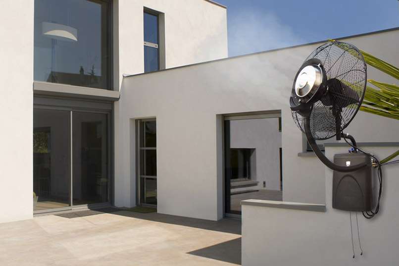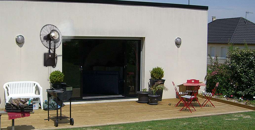 077 - ventilateur brumisateur mural haute performance - Le ventilateur brumisateur mural O'FRESH est une solution simple, efficace et économique pour rafraichir des grandes surfaces extérieures. Il est idéal pour les terrasses, les bars, les restaurants, les abords de piscine, les serres, les airs de jeux, les manifestations sportives, les maisons de retraite, les campings...