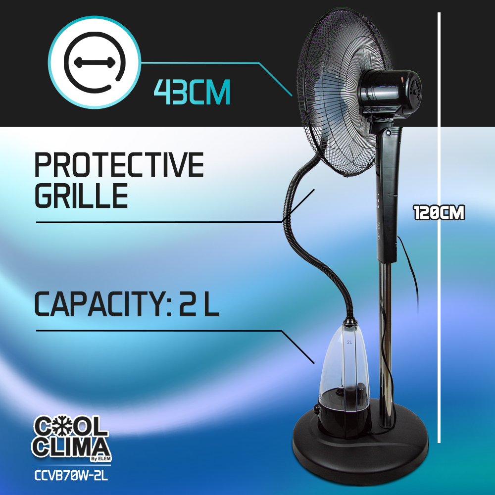 Restez au frais tout l'été grâce à ce ventilateur brumisateur oscillant 70 W de la marque Cool Clima. Sa fonction brumisateur le rend très rafraichissant grâce à la brume combinée à l'air en mouvement.