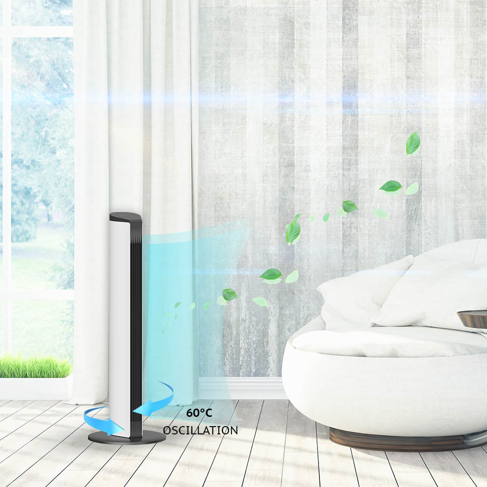 - Ventilateur colonne noir et blanc à oscillation: Vous recherchez un ventilateur au design élégant et discret ? Cette tour est idéale pour vous. Ayant une taille fine et une base stable, installez le ou vous le souhaitez et dirigez le a distance !