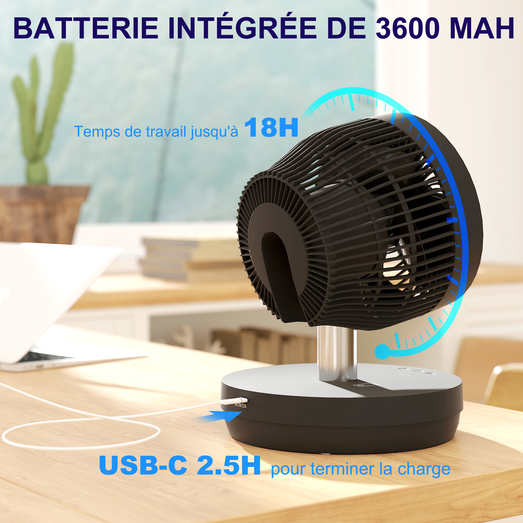 - Petit ventilateur avec une batterie rechargeable intégrée d'une autonomie de 2,5 à 18 heures, alimentée par USB-C