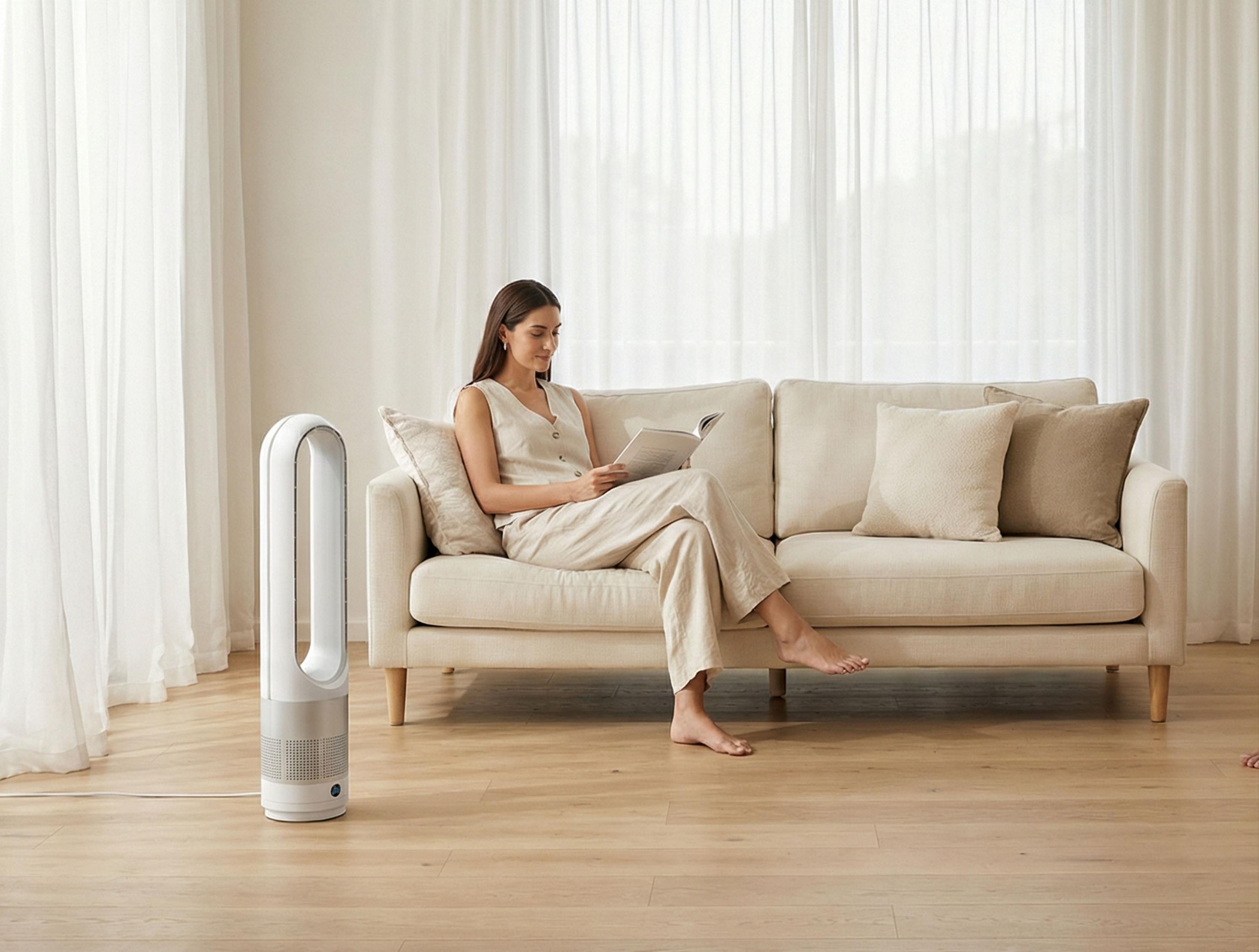Conçu pour être sûr et facile à nettoyer, il n'a pas de pales visibles ou d'éléments thermiques exposés, et s'éteint automatiquement en cas de basculement. Il est silencieux et aide à purifier l'air, idéal pour les chambres, les bureaux ou toute autre pièce de la maison.