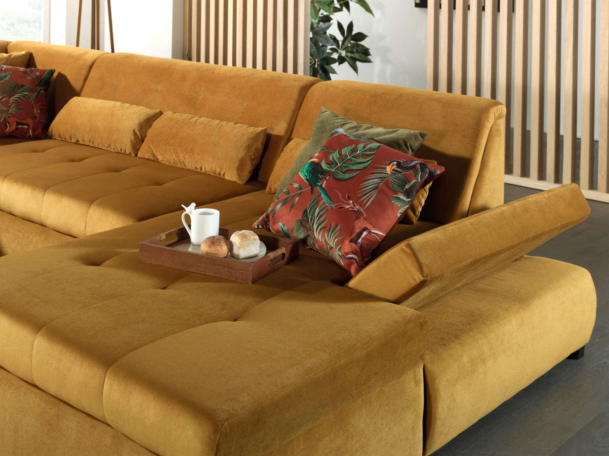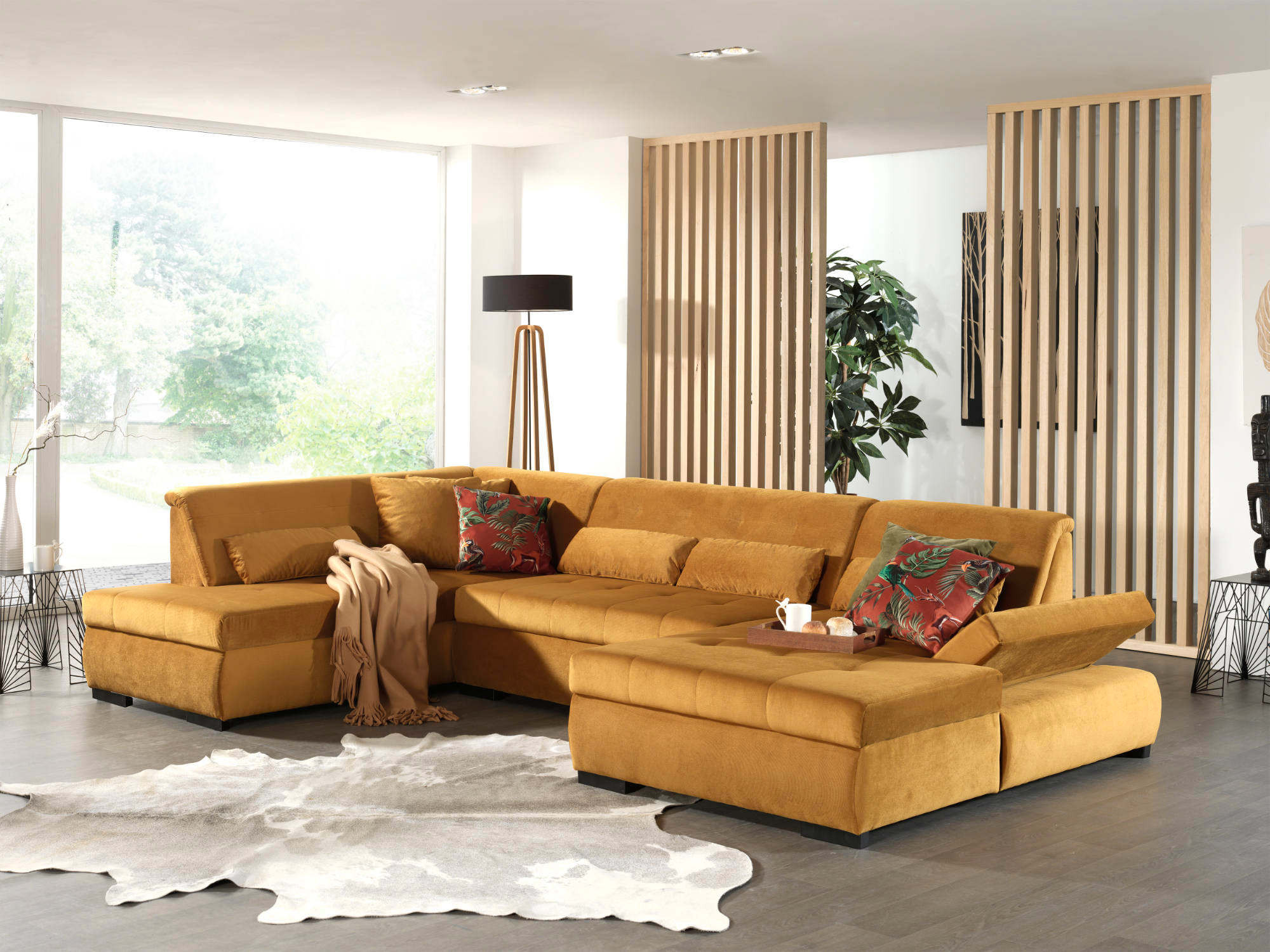 Le canapé d’angle panoramique en U Vermont vous séduira grâce à ses deux méridiennes et ses 3.35 mètres de largeur. Contemporain et moderne, il sera la pièce maîtresse de votre salon et pourra accueillir l’ensemble de vos proches grâce à son espace d’assise. Son revêtement en velours accentue l’élégance et le look moderne du canapé d’angle Vermont. Son assise, son accoudoir réglable en 3 positions et son dossier capitonnés agrémentés par des cales-reins et des coussins améliorent votre confort afin que vous puissiez vous détendre totalement.