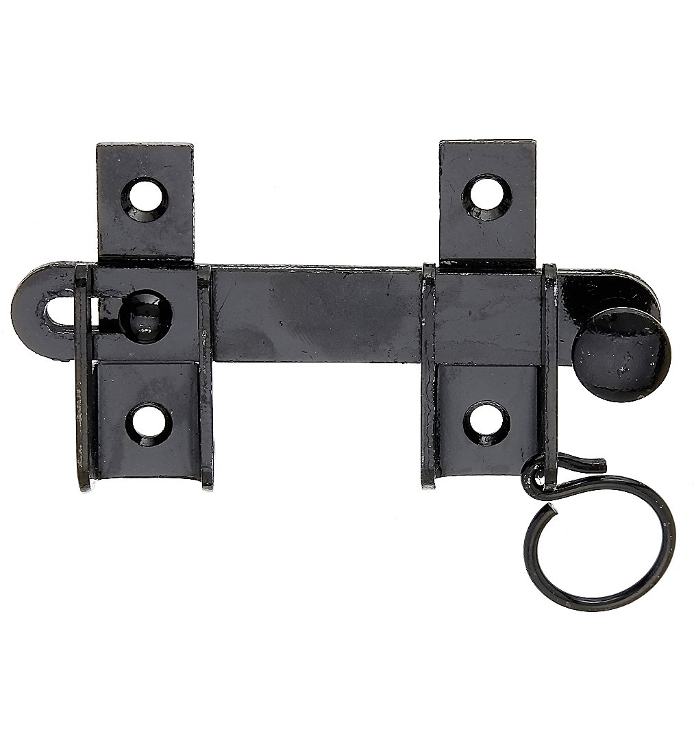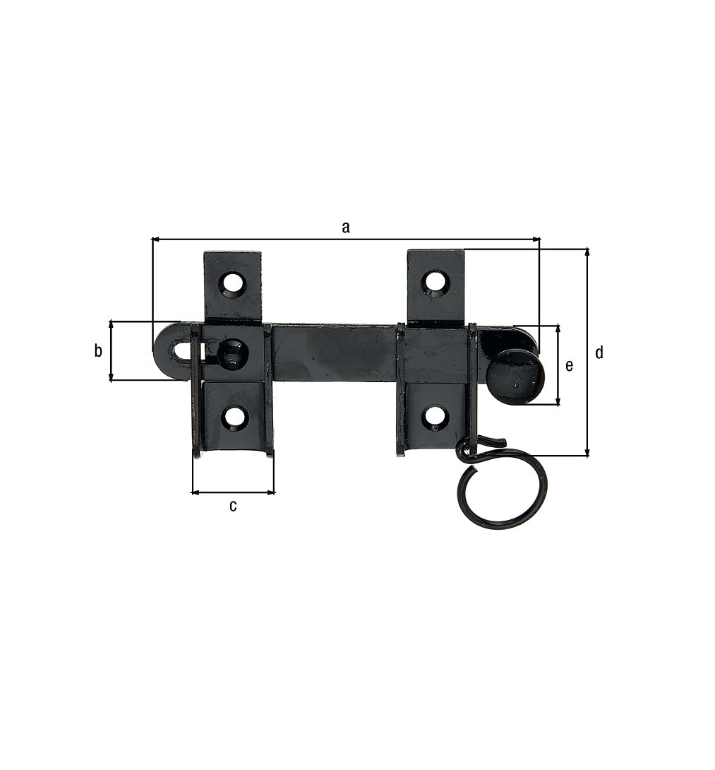Fermeture de volet fléau avec dispositif anti-soulèvement, avec trous de vis fraisés, Acier brut, Finition: laquée noire par immersion cataphorèse, Longueur totale: 120 mm, Largeur de jetée: 18 mm, Largeur platine à visser: 18 mm, Hauteur platine à visser: 65 mm, Nombre de trous: 4, Trou: Ø6 mm