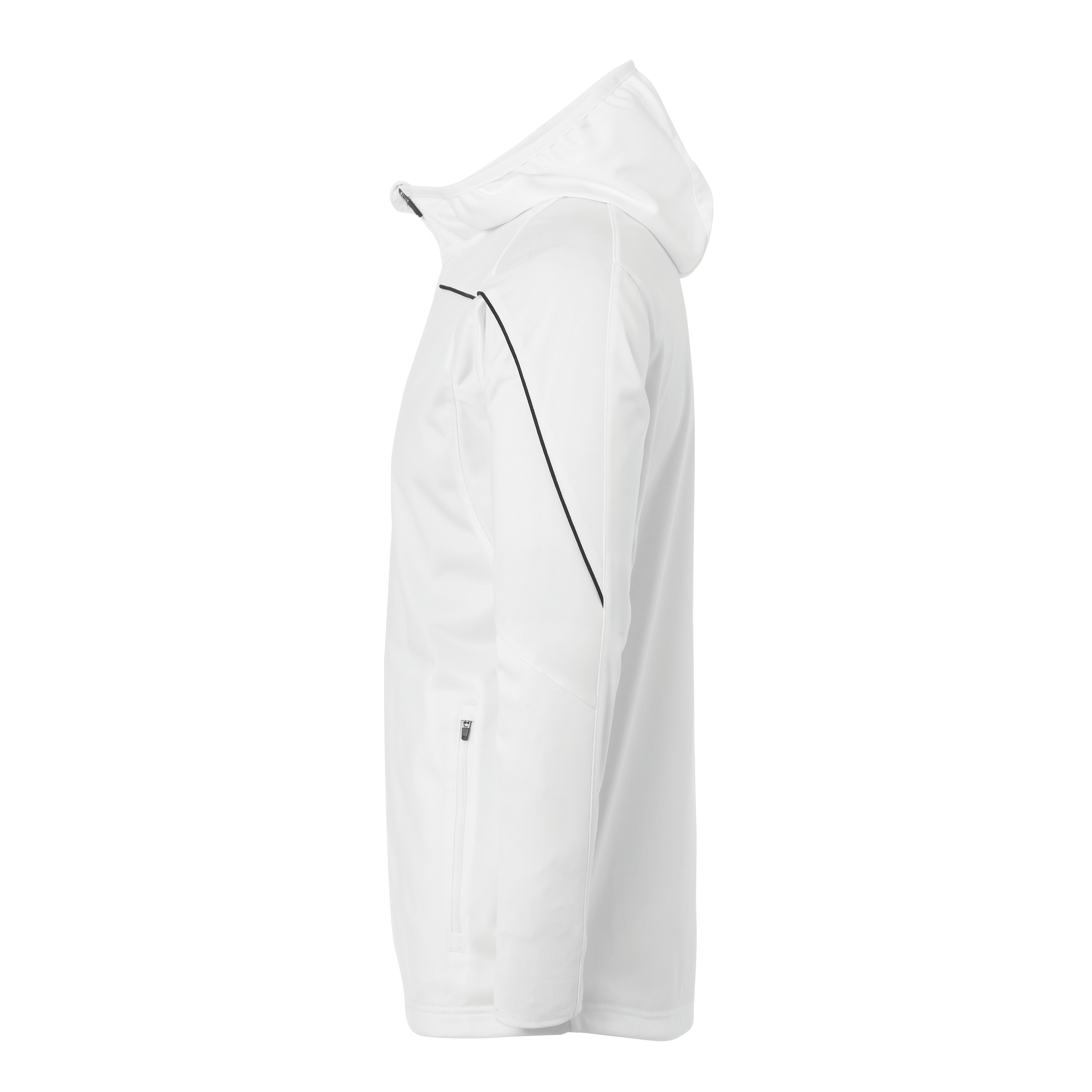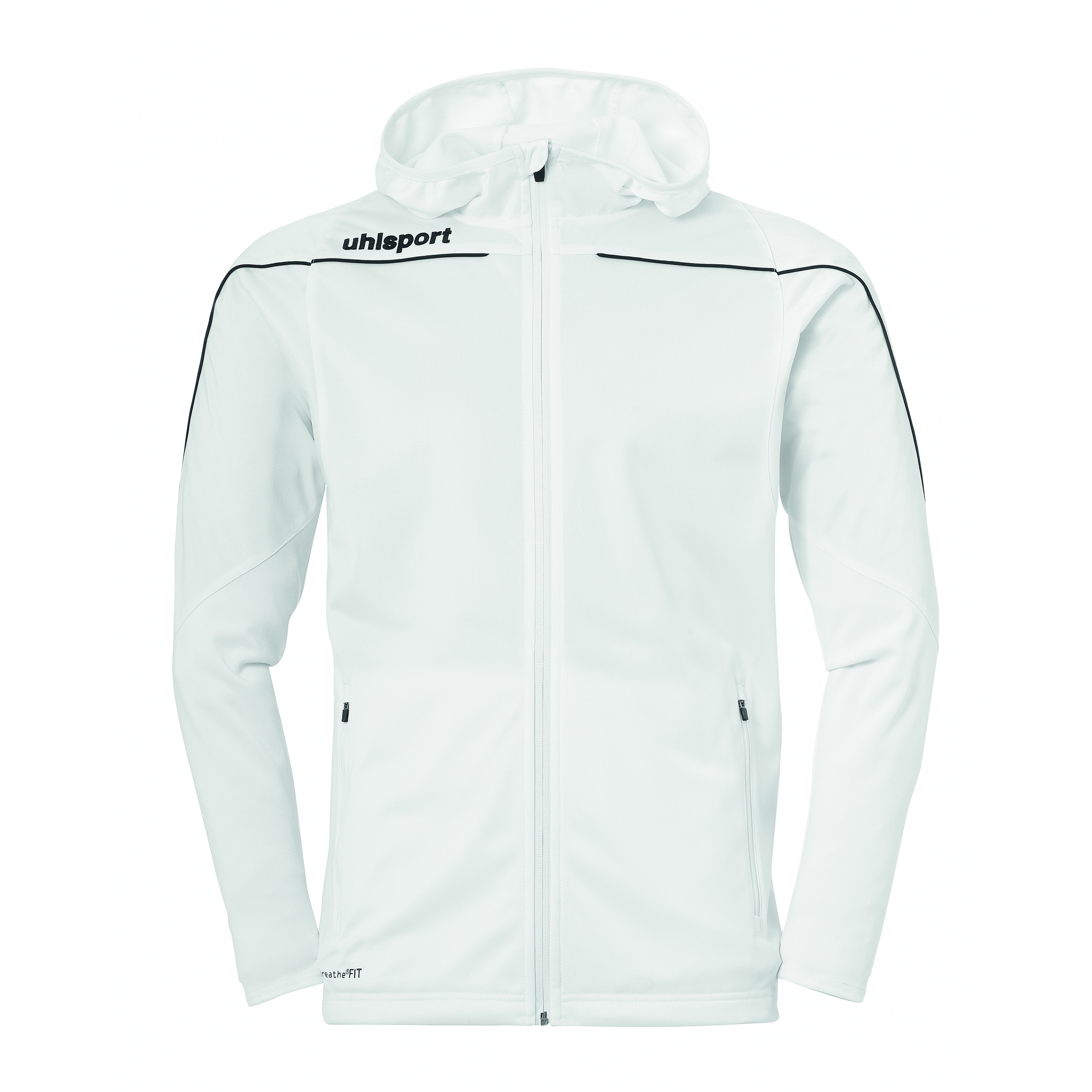 Veste de survêtement avec capuche inserts élastiques aux manches manches Liseré sur la poitrine et les manches. Deux poches latérales avec fermeture éclair Lien élastique sur la capuche, les manches et la ceinture. Fermeture éclair dans la partie arrière pour favoriser l'impression. Libellé Uhlsport sur la poitrine.