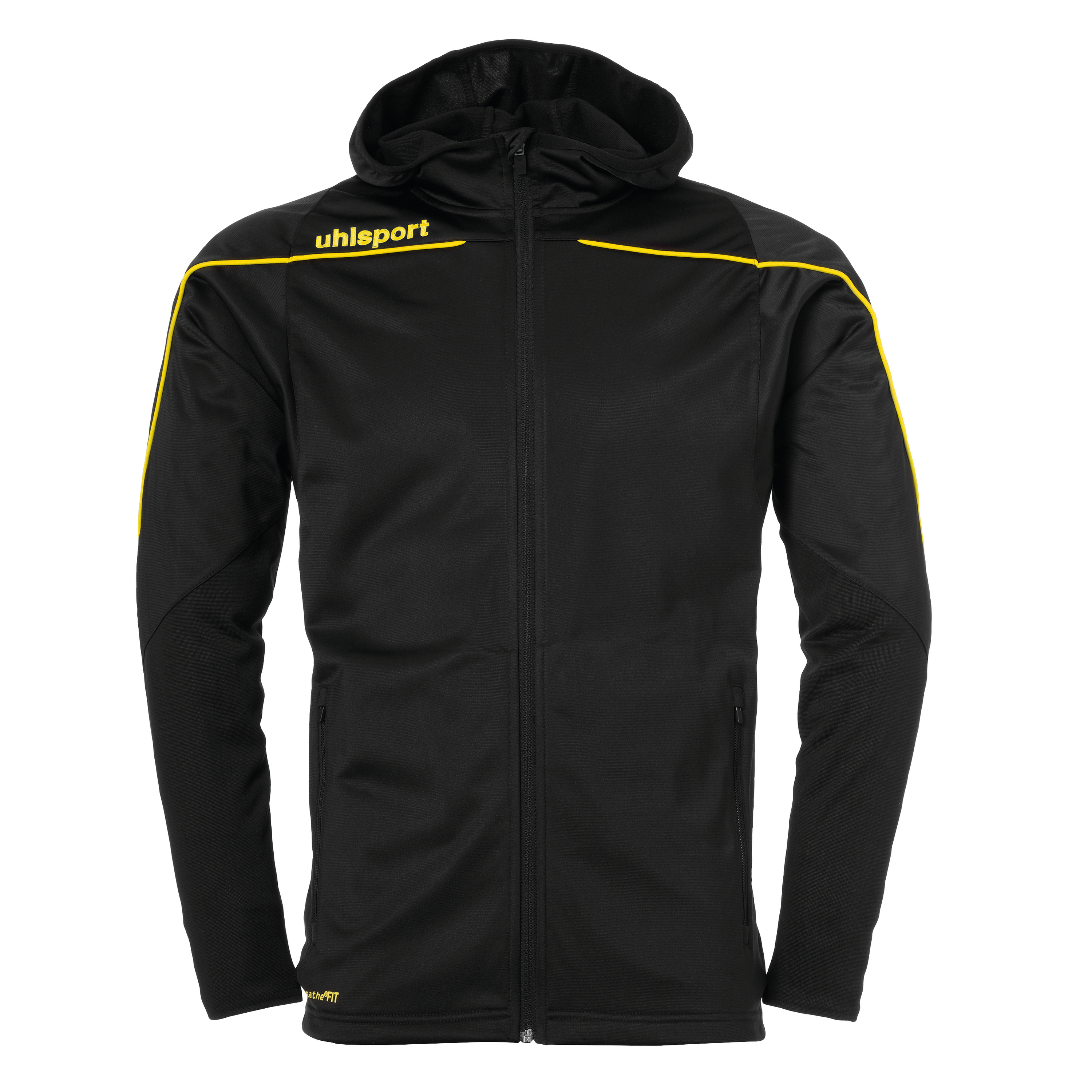 Veste de survêtement avec capuche inserts élastiques aux manches manches Liseré sur la poitrine et les manches. Deux poches latérales avec fermeture éclair Lien élastique sur la capuche, les manches et la ceinture. Fermeture éclair dans la partie arrière pour favoriser l'impression. Libellé Uhlsport sur la poitrine.