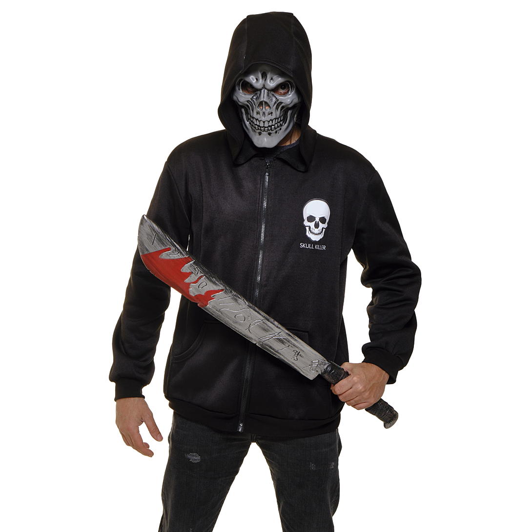Un sweat à capuche avec femeture éclair, imprimé d'une tête de squelette sur la poitrine et un masque de squelette gris avec attache velcro.