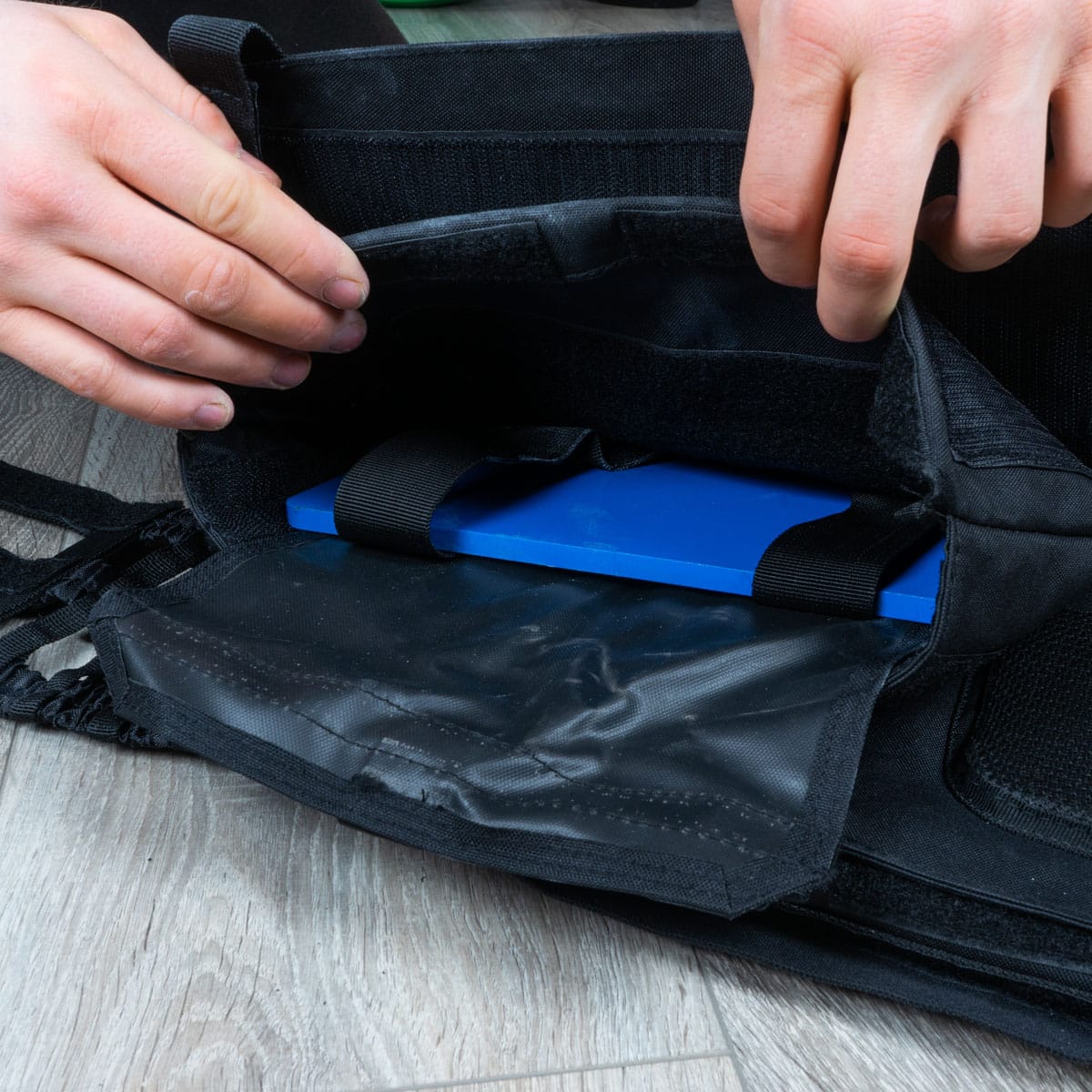 Chaque plaque de poids en acier recouverte d’un film anti-corrosion se glisse et se verrouille aisément dans des poches robustes munies de rabats velcro. Les coutures renforcées supportent des milliers de cycles d’entraînement, tandis que le filet respirant évacue efficacement la transpiration pour éviter l’effet “sac plastique”.