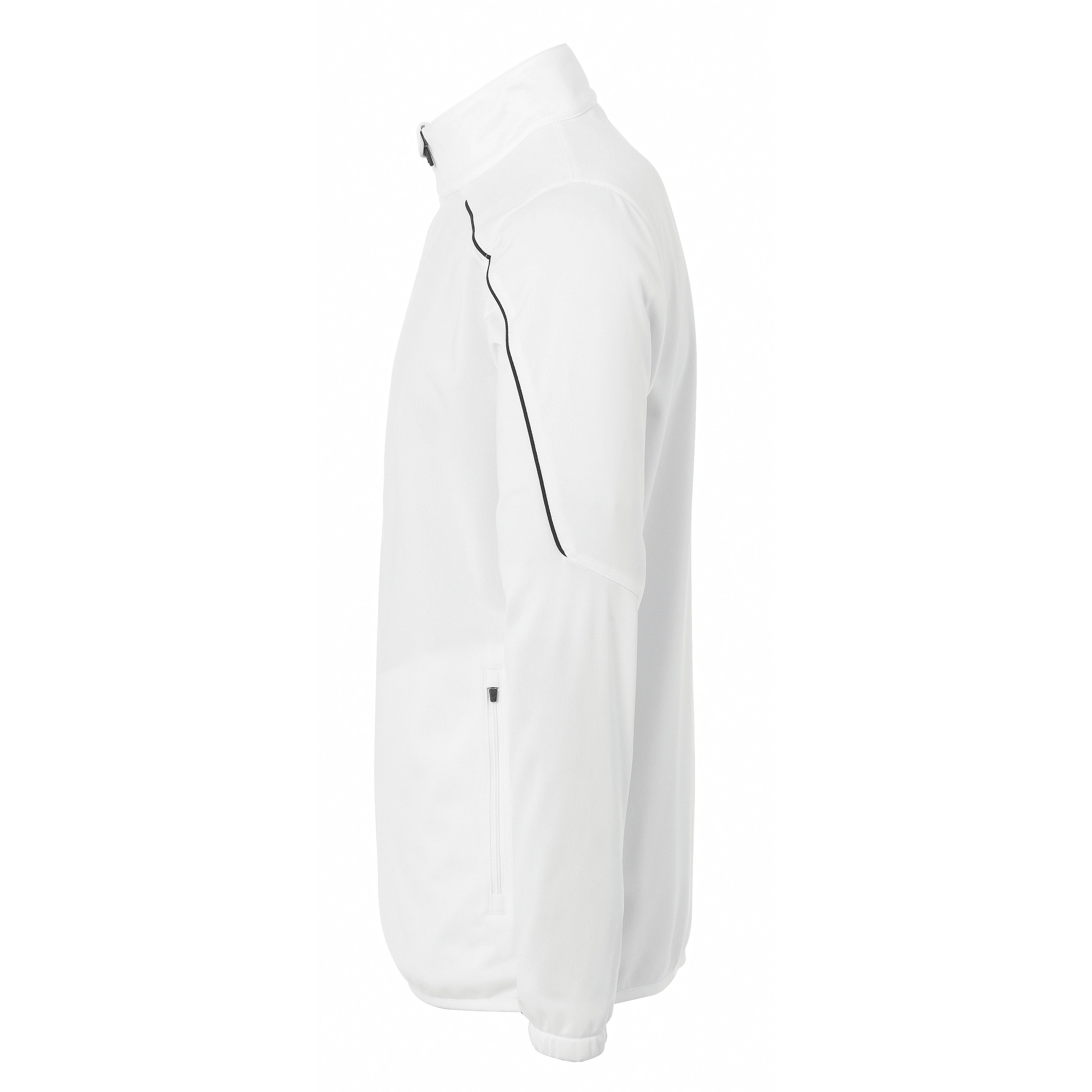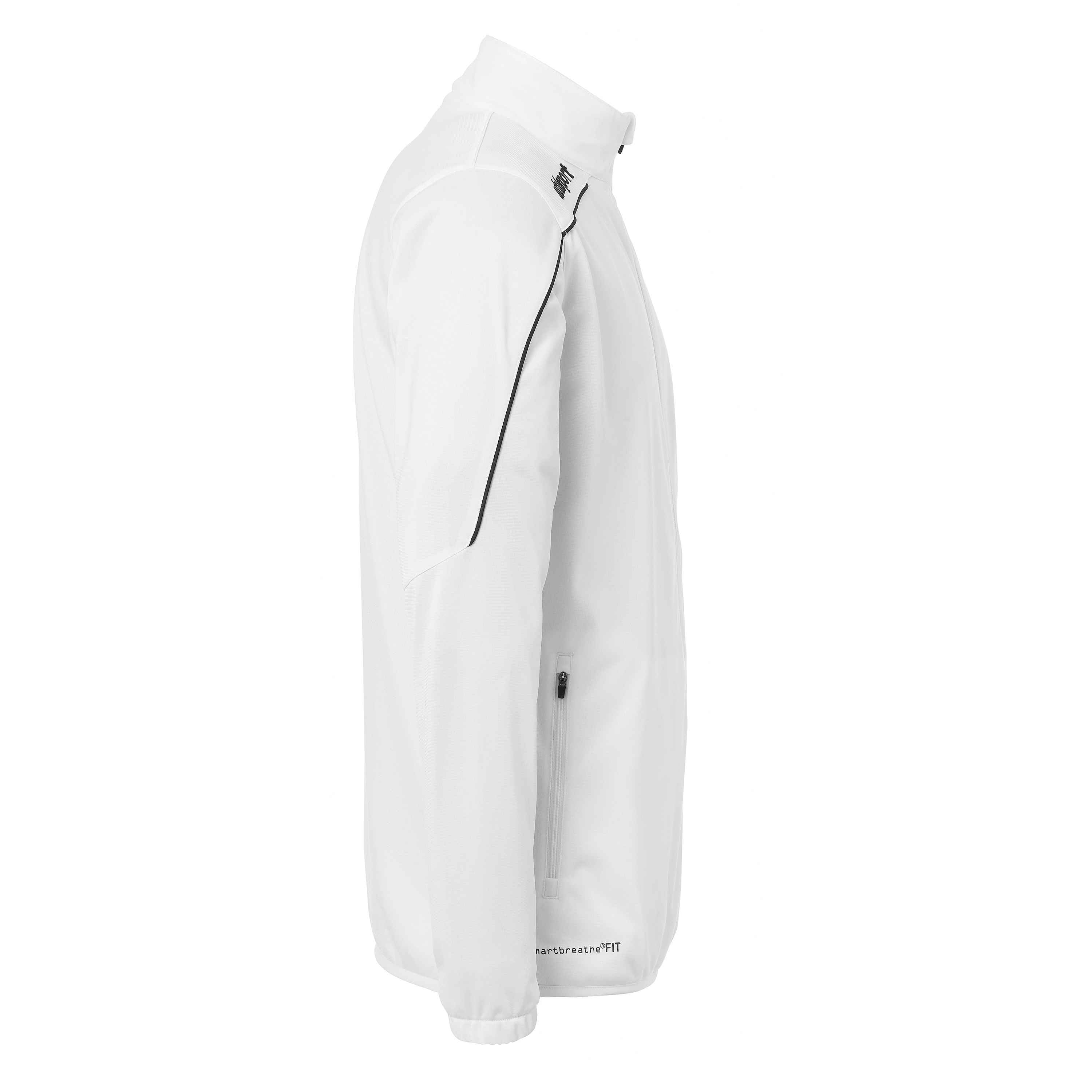 Veste de survêtement inserts élastiques aux manches manches Liseré sur la poitrine et les manches. Deux poches latérales avec fermeture éclair Lien élastique sur la capuche, les manches et la ceinture. Fermeture éclair dans la partie arrière pour favoriser l'impression. Libellé Uhlsport sur la poitrine.