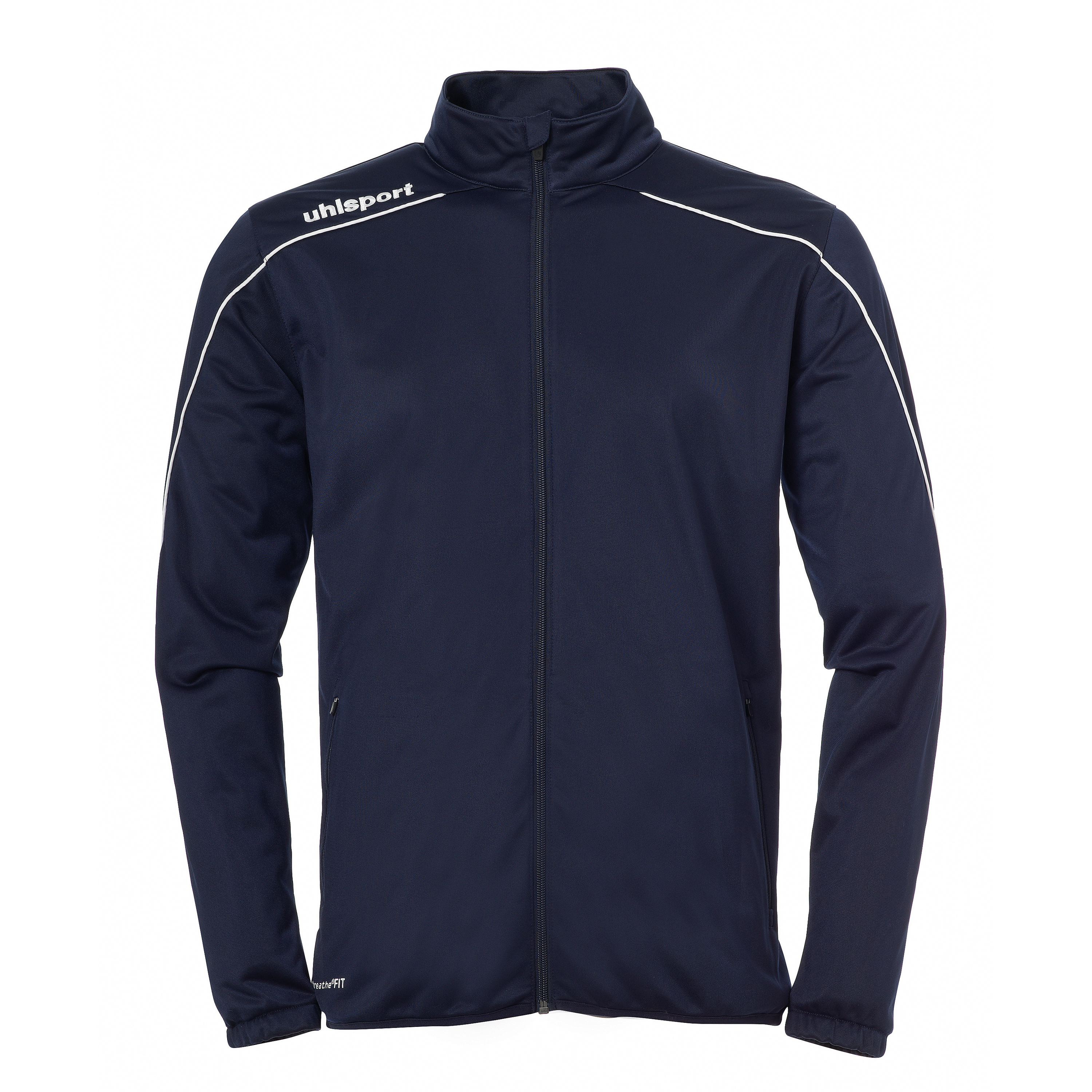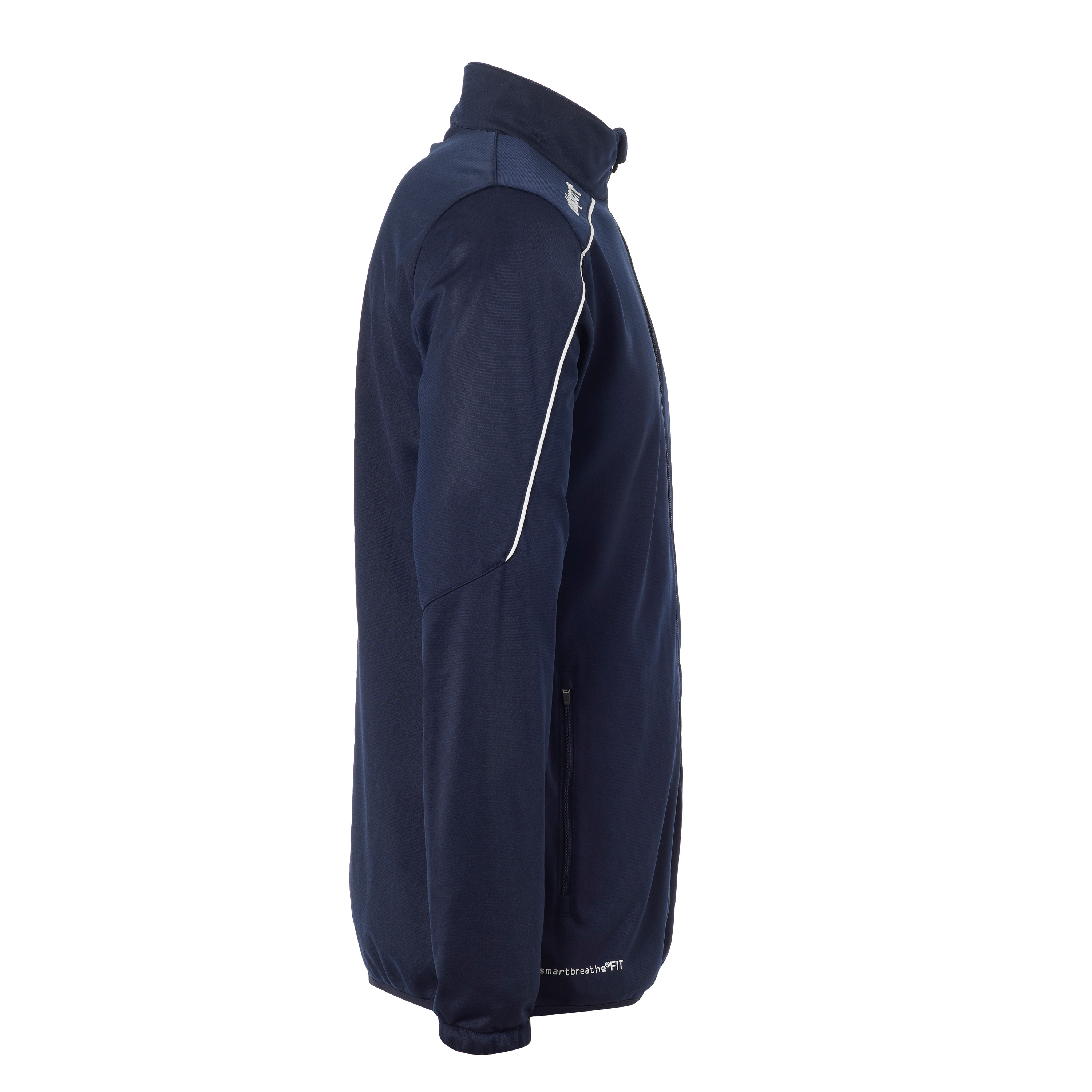 Veste de survêtement inserts élastiques aux manches manches Liseré sur la poitrine et les manches. Deux poches latérales avec fermeture éclair Lien élastique sur la capuche, les manches et la ceinture. Fermeture éclair dans la partie arrière pour favoriser l'impression. Libellé Uhlsport sur la poitrine.