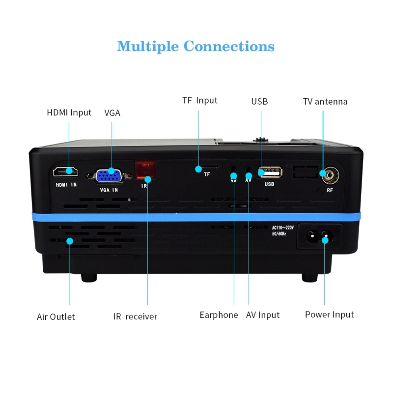Sur ce vidéoprojecteur 1080p, vous avez un port HDMI, un port USB, un port VGA, un port AV, un port S-Vidéo, un port pour carte SD et plusieurs autres entrées. Grâce à la fonction MHL, vous pouvez projeter l'écran de votre téléphone portable pour le partager avec les personnes autour de vous. Aucune inquiétude pour les remplacements de lampes, ce vidéoprojecteur est doté de diodes LED qui fonctionnent sur plus de 20.000 heures sous une puissance moyenne de 60W. Ils vous permettront de faire des économies très intéressantes sur votre facture d'électricité. Dans le carton de l'appareil, vous trouverez un manuel d'utilisation, un adaptateur pour les prises secteur, une télécommande et un câble qui sert au branchement.