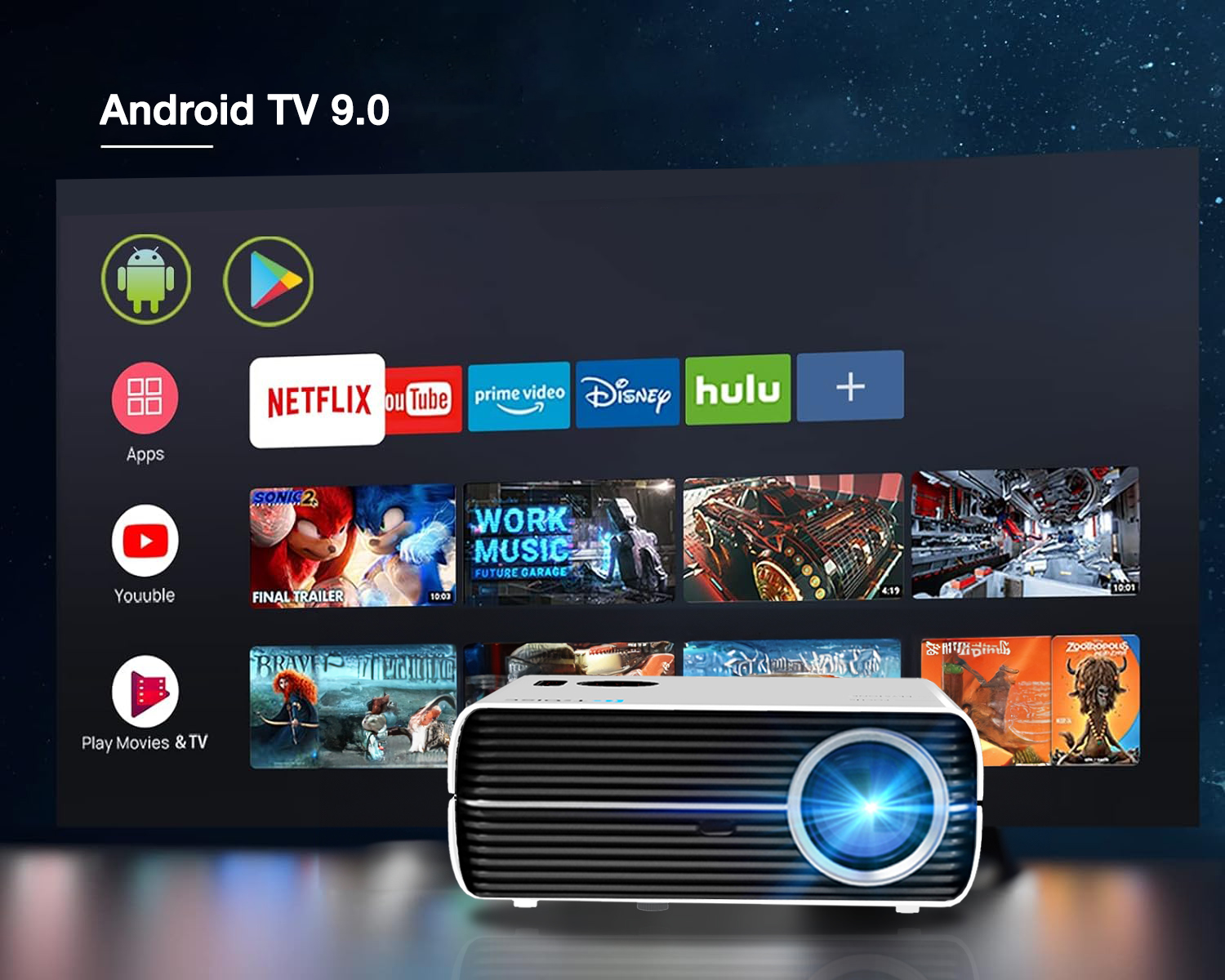 ➥ Le système Android TV 9.0 étend les fonctions du projecteur en accédant à toute la gamme d'applications disponibles dans