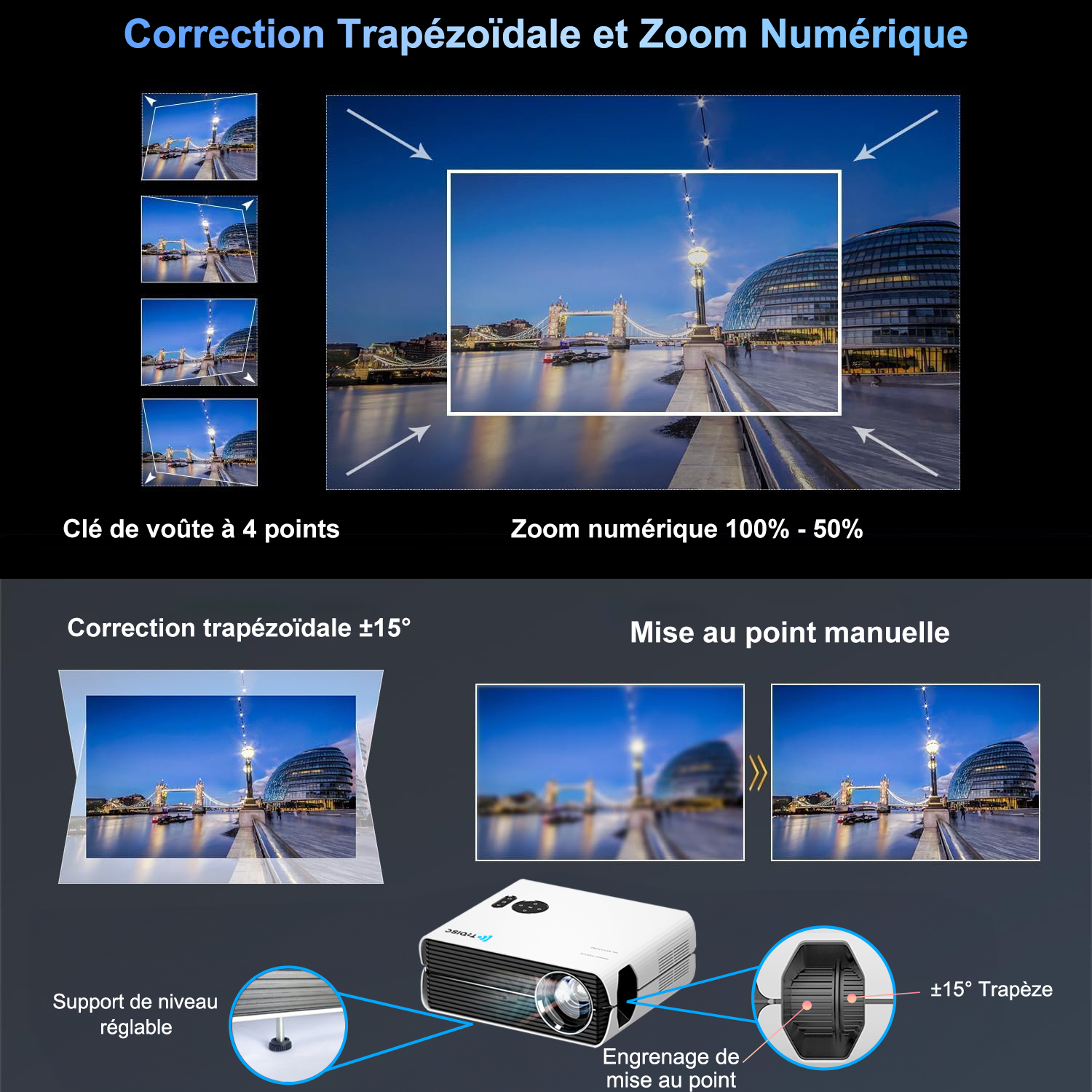 ➥ Qualifié avec une correction trapézoïdale de ±15° et un réglage trapézoïdal à 4 points et une fonction de zoom numérique
