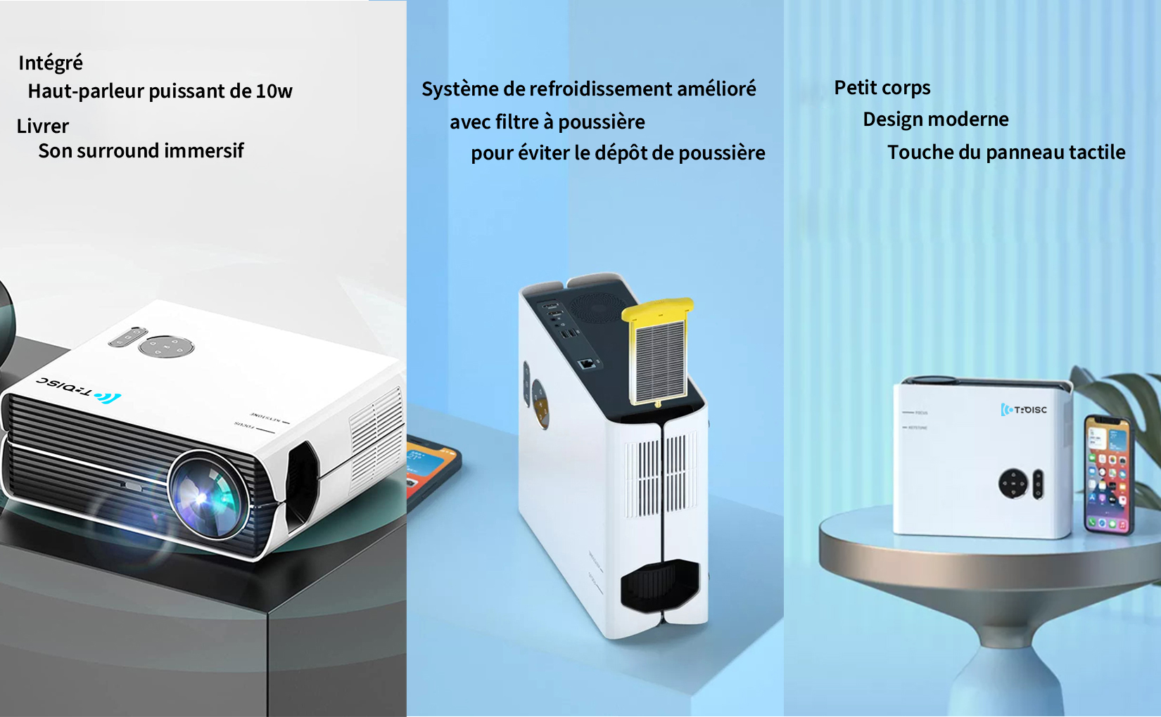 | Libellé | Vidéoprojecteur TROISC DELTA FULL HD 1080p 10000 Lumens Android 9 Bluetooth WIFI Recopie L'écran Projection Latérale 300 Max Zoom Blanc avec support |