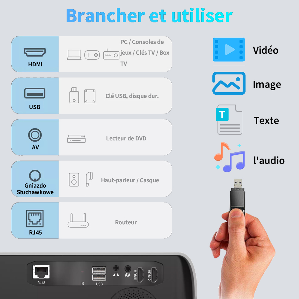 ➥ Branchez le périphérique USB et lisez du contenu comme des images, des films, des vidéos ou des textes.️