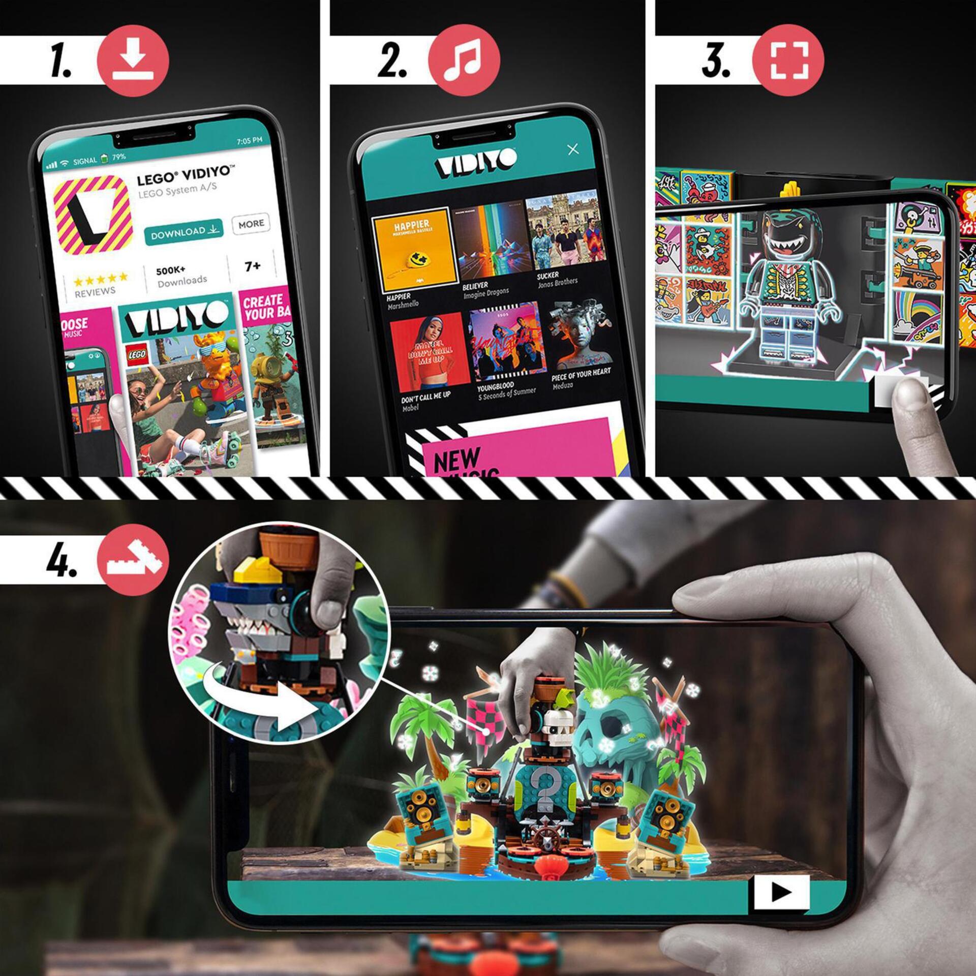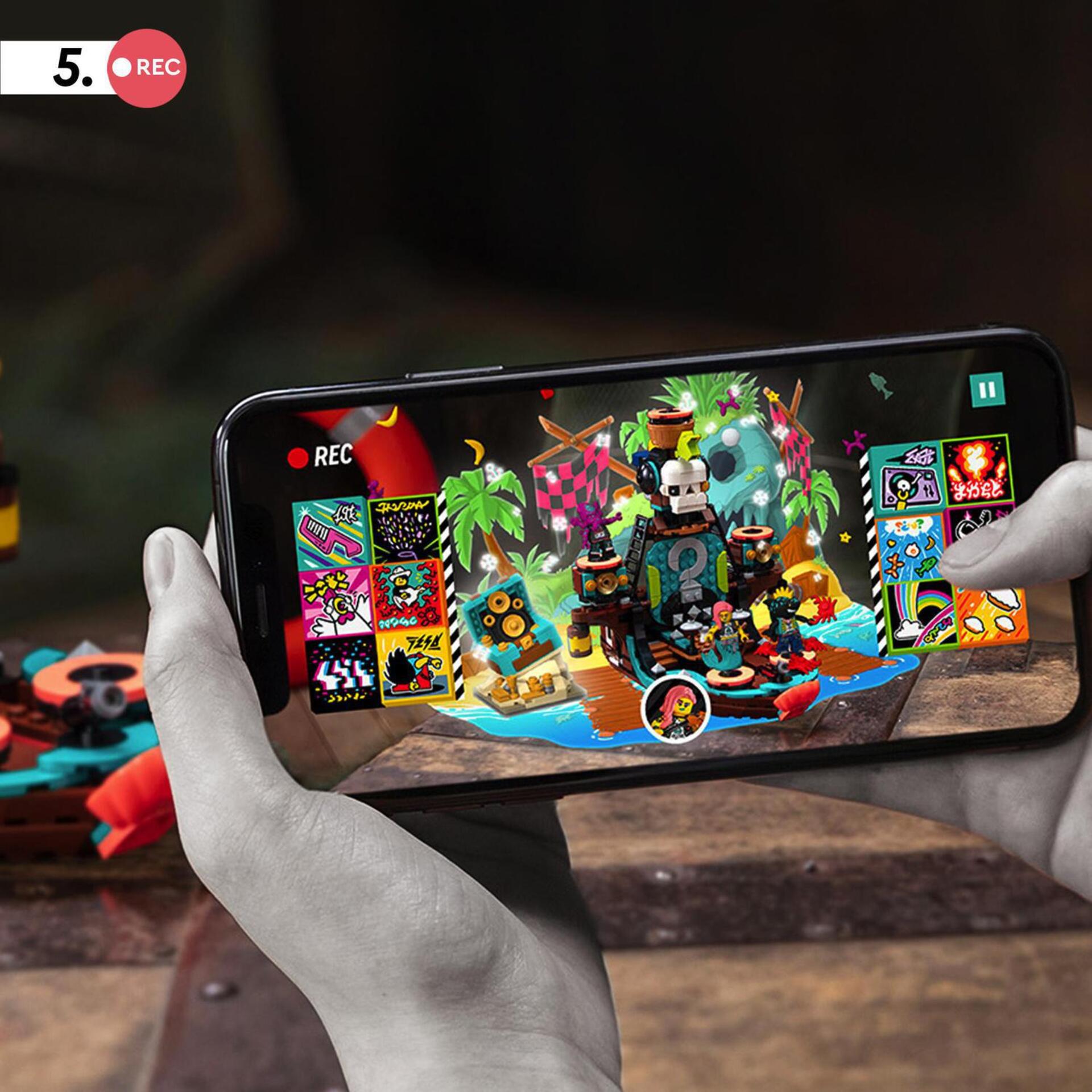 Faites découvrir lunivers des clips vidéo aux enfants en leur proposant de réaliser, produire et interpréter leurs propres clips punk rock avec LEGO® VIDIYO Punk Pirate Ship (43114). Téléchargez lappli gratuite, scannez les 3 figurines et révélez leur personnalité. Utilisez lappli pour scanner le bateau et le voir se transformer en scène. Les enfants vont adorer produire des clips à partager avec dautres créateurs dans le flux social sécurisé.Tous au spectacle !Le bateau Punk Pirate Ship offre des heures de jeu hors ligne et avec lappli. En tournant les têtes, les haut-parleurs et les éclairages du modèle, les enfants modifient le décor inspiré de la piraterie de leurs clips.Créateur dexpériences musicalesLes sets LEGO VIDIYO offrent une expérience de jeu social sûre et proposent aux enfants de devenir réalisateurs et stars de leurs clips. La production de vidéos alliant mélanges musicaux, personnages amusants, chansons, danses et effets spéciaux stimule la créativité.